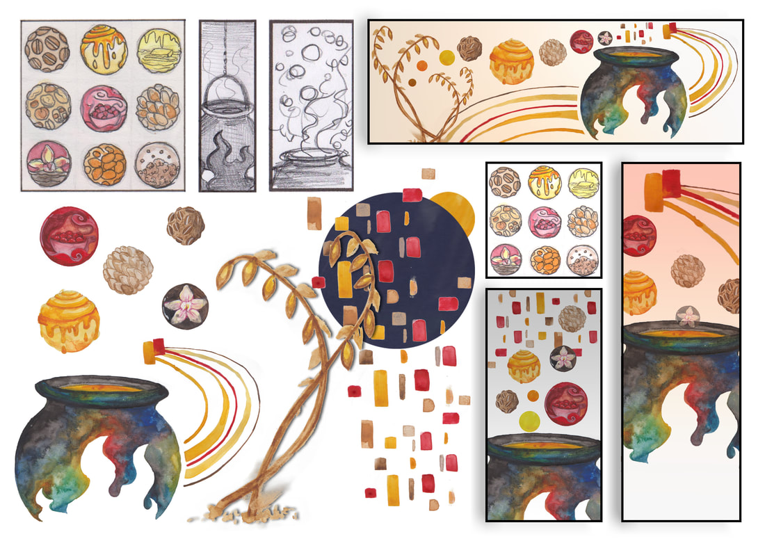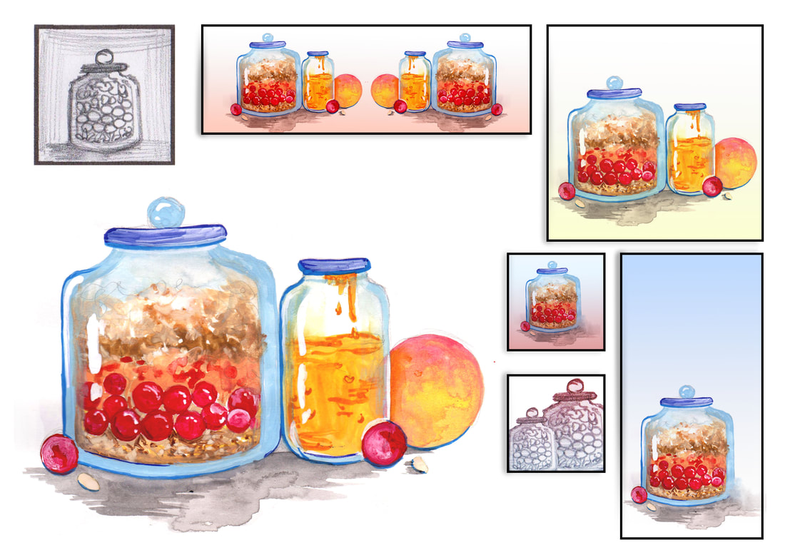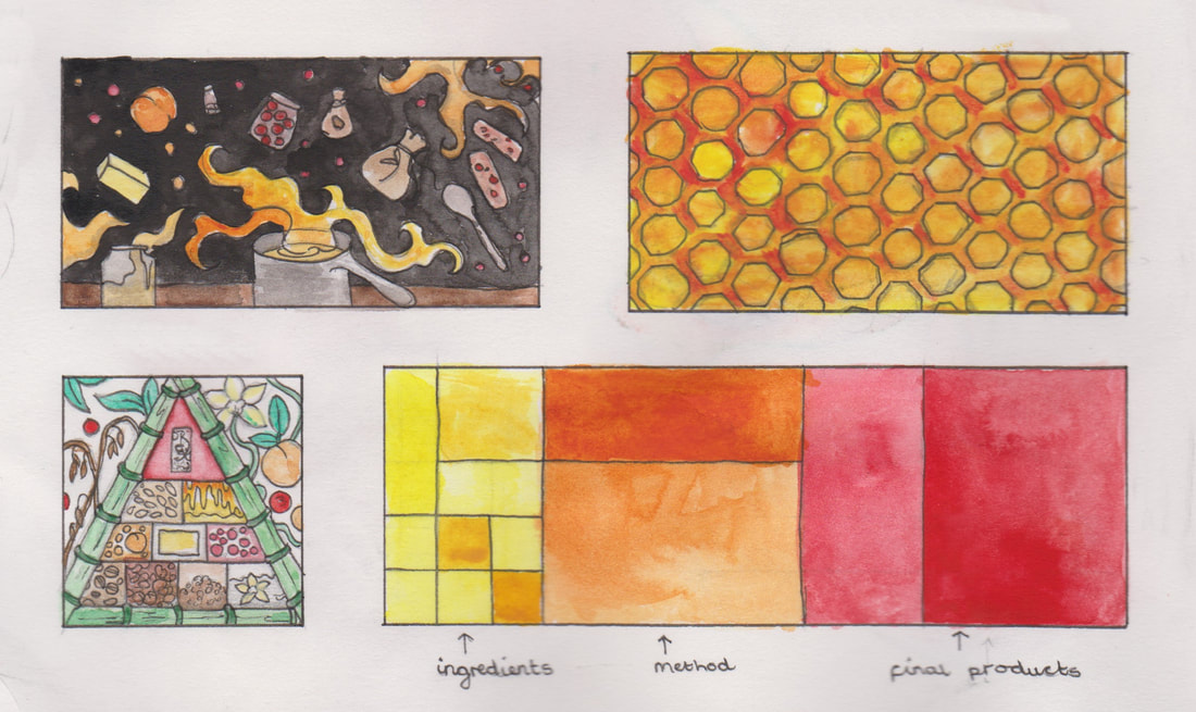 These developments were created using a mix of watercolours and inks, I really like how the jars turned out, additionally I think I could further develop the long rectangle with the porridge oat stem into a nice design if I used the length to show the baking process. I could put the ingredients at the top, then show the baking/mixing in the middle, and the finished product at the bottom.