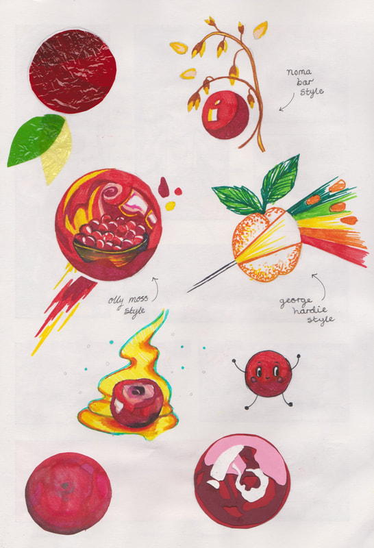 I also tested different styles, I experimented with most of these materials and styles by drawing a collection of glazed cherries so I could directly compare the outcomes.