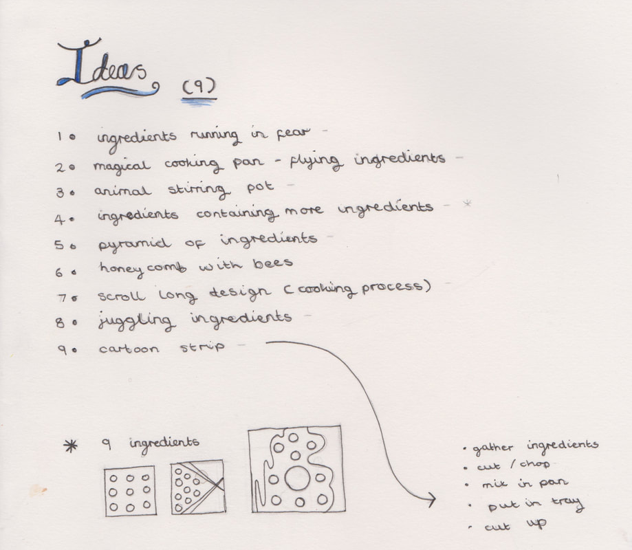 I then moved onto development using watercolour, these designs are inspired by Olly Moss, Giuseppe Arcimboldo and Yuni Yoshida. I really like the idea of having the ingredients in the shape of spheres, this way I can show the amounts by the size of each sphere in relation to the others. I would need to refine this idea my I think it is promising concept. Additionally I really liked how the lines to the side of the pot looked, it seems to give a sense of action and movement that is integral to the baking process, I think there is more I could do with these lines.