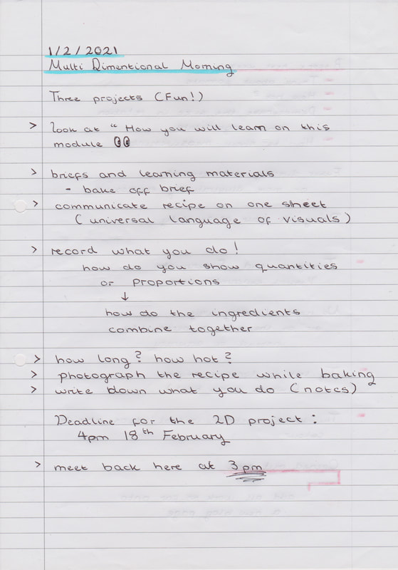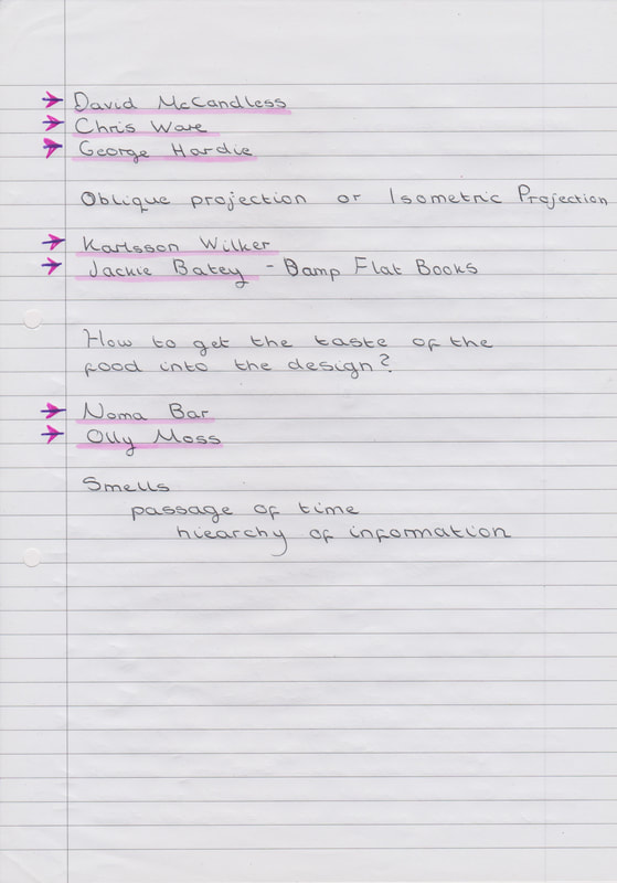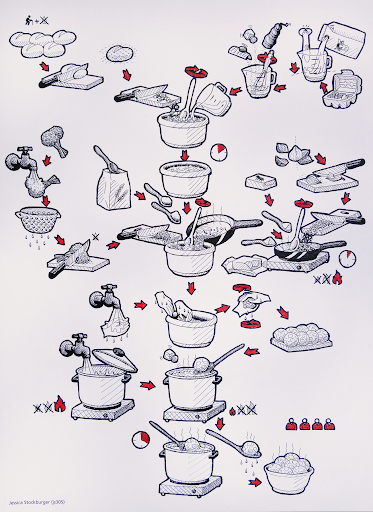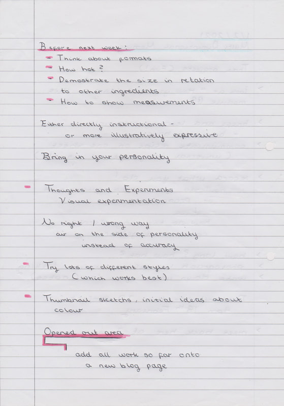 The Brief: The task is simple. To communicate a recipe on one single sheet without words, using one of the following formats – landscape or portrait: Stage 1: Research: The first step is to make the one of the recipe options. It's really important to record exactly what you do - ingredients, tools, quantities, preparation, mixing, cooking, etc. Use multiple methods to record the process - diagrams, drawing, photography, etc. Even though we're not using words, writing can be helpful too. You want as much primary source material to work with as possible from this stage. |