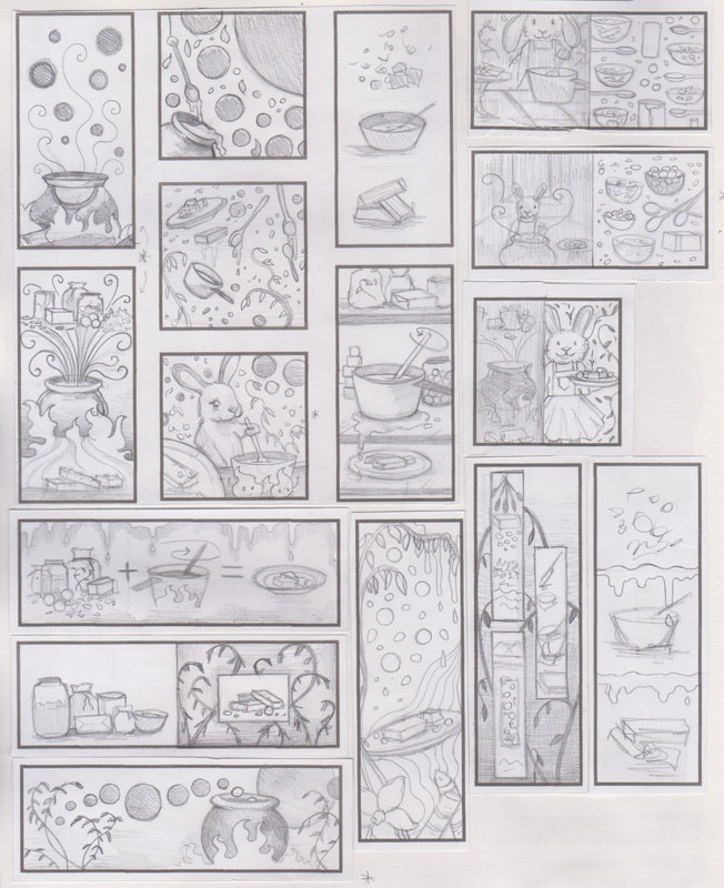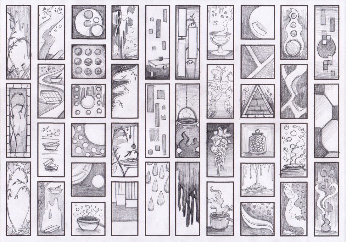 Within these development thumbnails I drew inspiration from my original thumbnails as well as the artist research. There are some thumbnails that I liked more than others, and this process gave me to chance to separate the good ideas from the ones that I won't take any further.