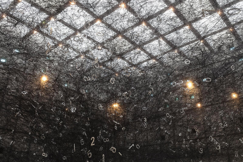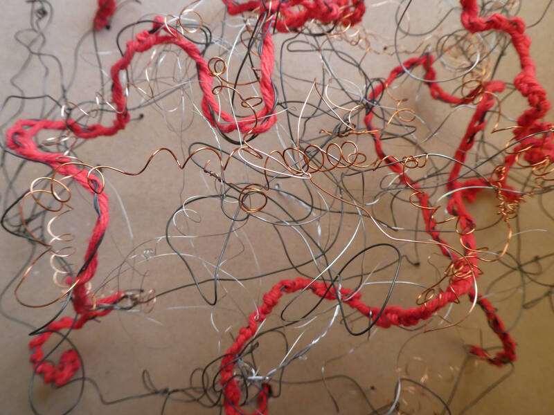 To create the "thought process" for the top of my design I cut a piece of card out and used it to weave threads, wire and string onto the surface.
