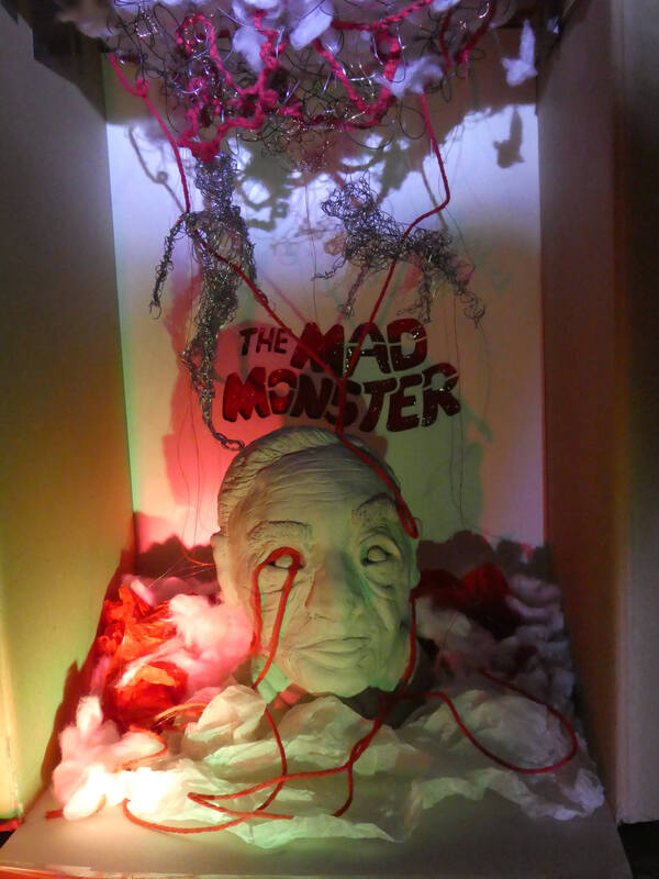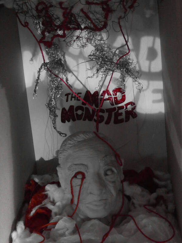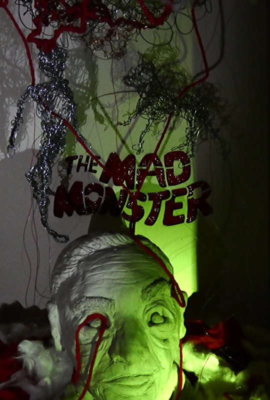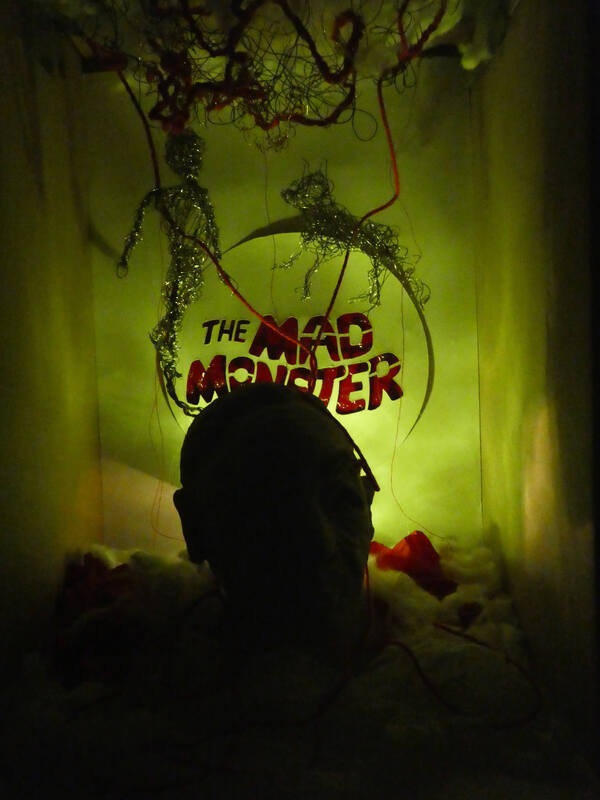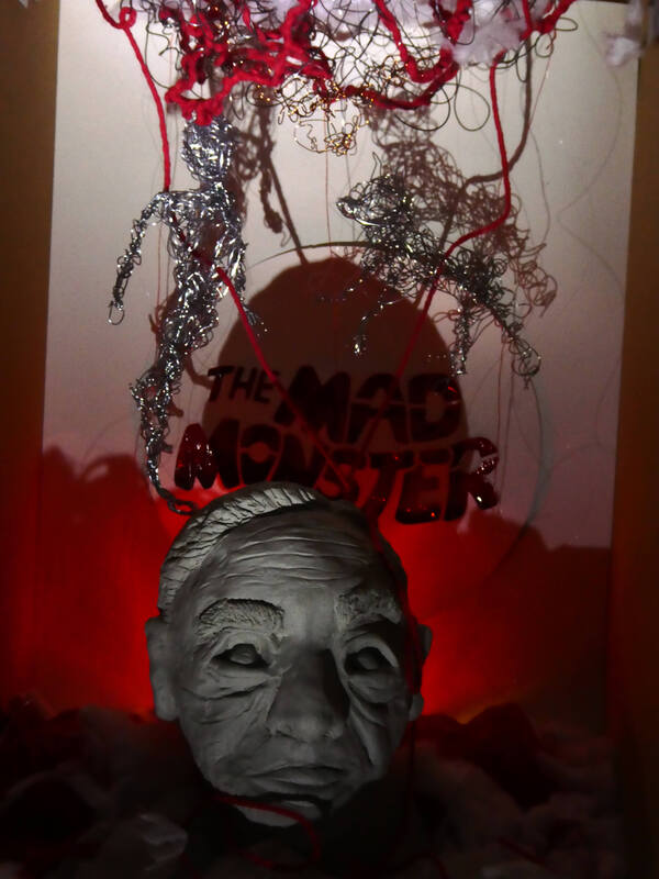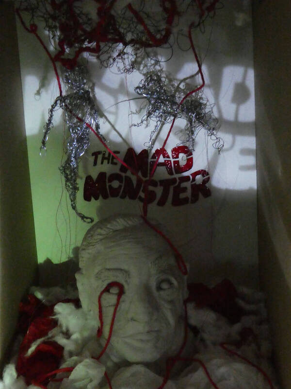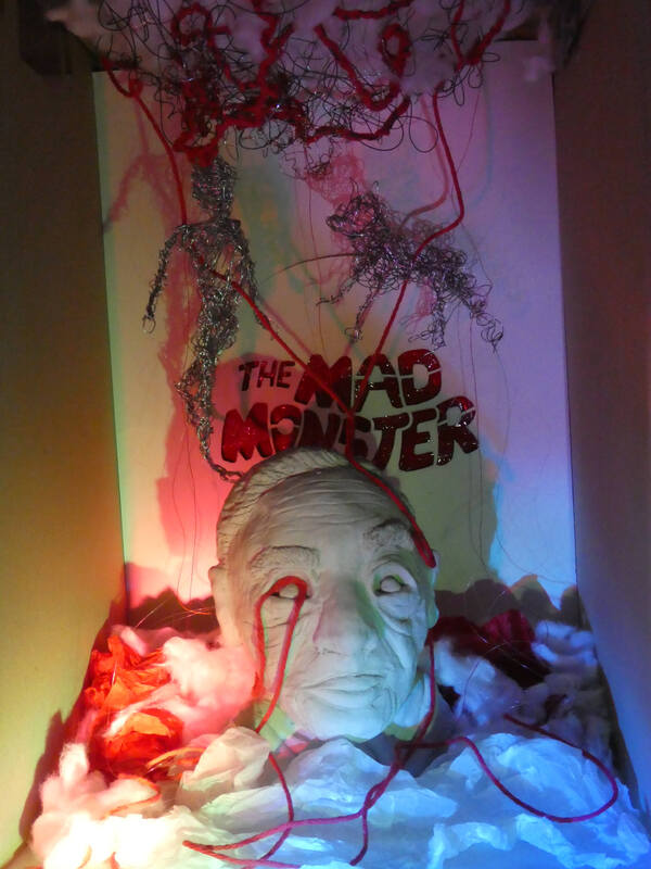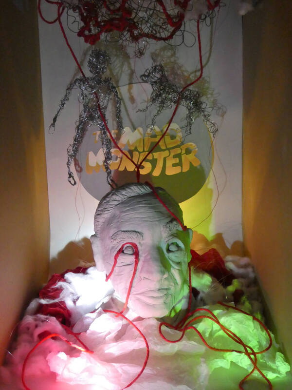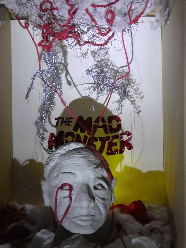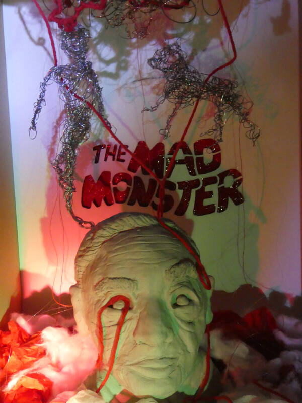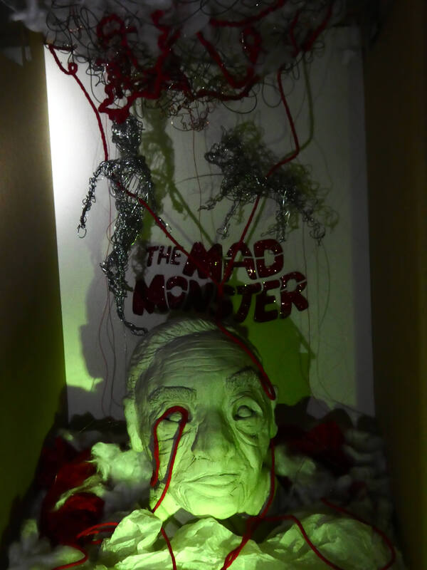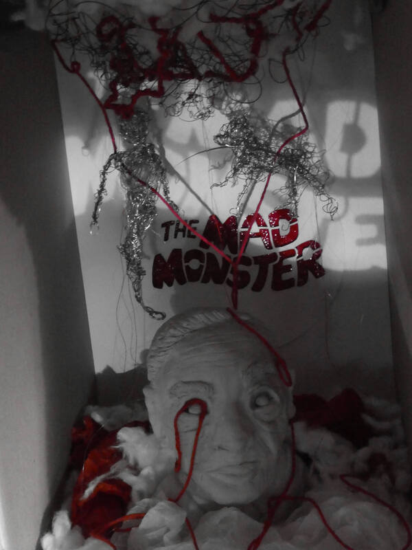 Final Poster I have selected this photograph as my final piece, unfortunately the "the" in the title has been obscured a little by the leg of the wire man. However this is still my favourite image that I have taken so far. I think that the different colours have worked well together to give the image an appearance that reflected the original "The Mad Monster" posters. I also like the way that the image is slightly messy and chaotic, this seems to reflect the mind of the scientist. Additionally I managed to create an imposing shadow behind the scientist that helps to pop him out from his background. To add to my image I decided to project the title onto the composition a second time, this has created an interesting effect that I think added to the appearance of this image. Overall I have found this 3D project to be a bit challenging, even though I did a a fair amount of testing I still found it difficult to create a whole image that could work as a poster. But I think I have learned a lot about how to work in 3D during this project. I have made some mistakes during the creation of my final piece, but I have learned from them so I will know how to make a more effective 3D illustration in the future. |