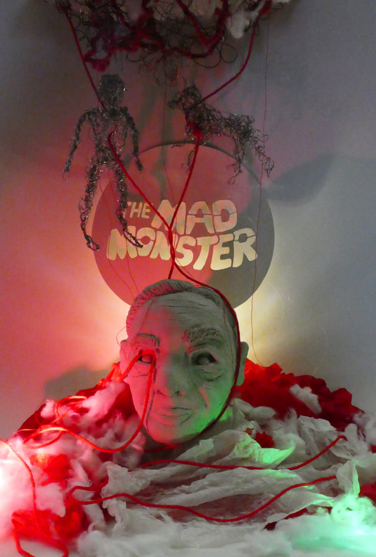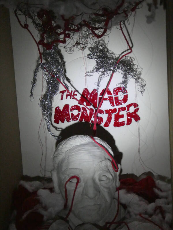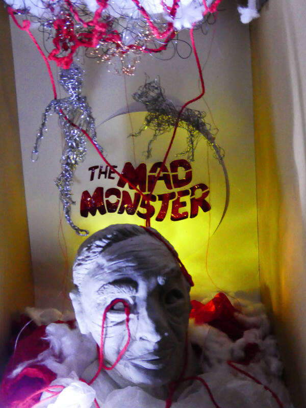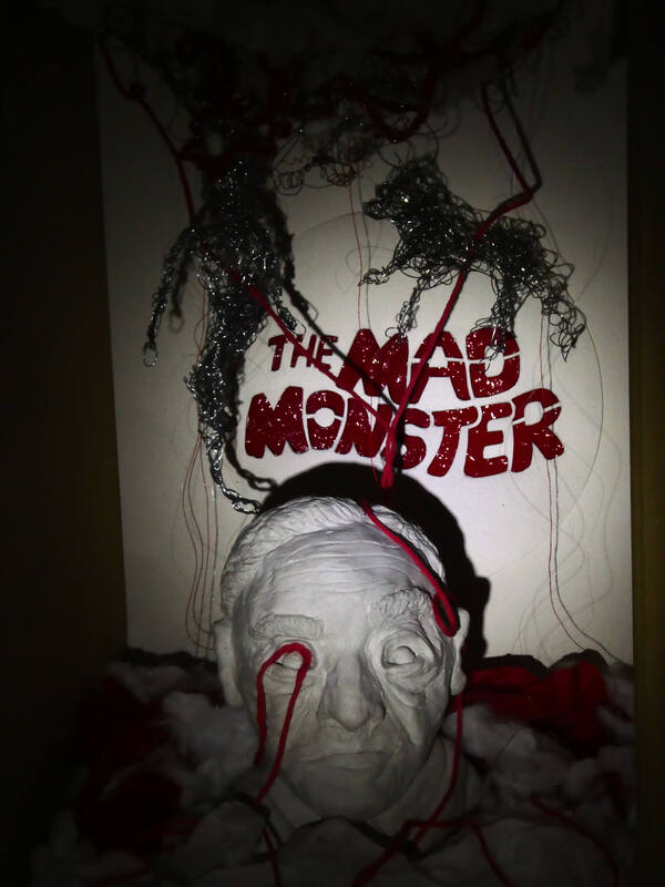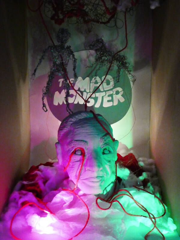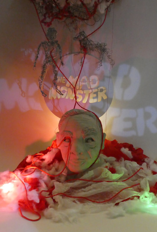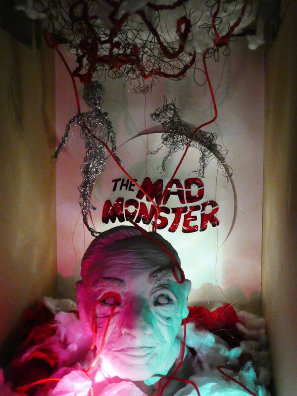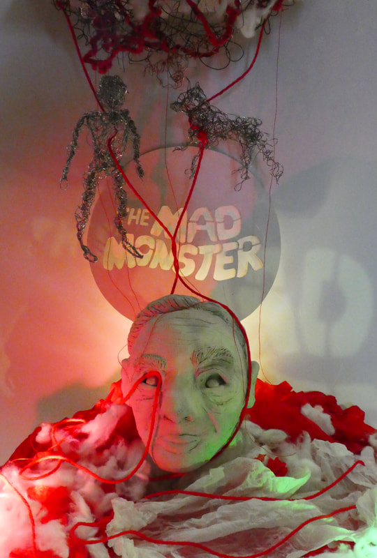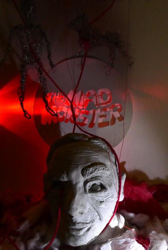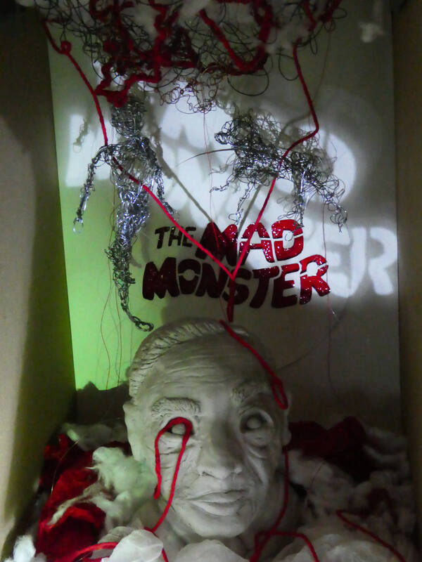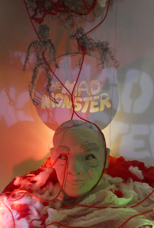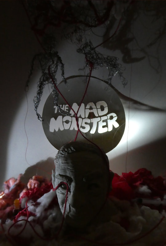 Final Poster I have selected this photograph as my final piece, unfortunately the "the" in the title has been obscured a little by the leg of the wire man. However this is still my favourite image that I have taken so far. I think that the different colours have worked well together to give the image an appearance that reflected the original "The Mad Monster" posters. I also like the way that the image is slightly messy and chaotic, this seems to reflect the mind of the scientist. Additionally I managed to create an imposing shadow behind the scientist that helps to pop him out from his background. To add to my image I decided to project the title onto the composition a second time, this has created an interesting effect that I think added to the appearance of this image. Overall I have found this 3D project to be a bit challenging, even though I did a a fair amount of testing I still found it difficult to create a whole image that could work as a poster. But I think I have learned a lot about how to work in 3D during this project. I have made some mistakes during the creation of my final piece, but I have learned from them so I will know how to make a more effective 3D illustration in the future. |