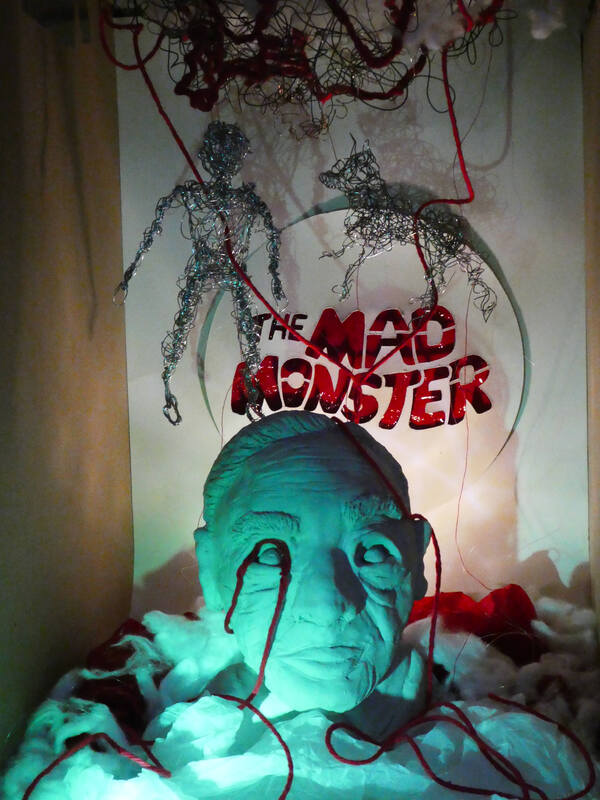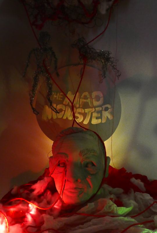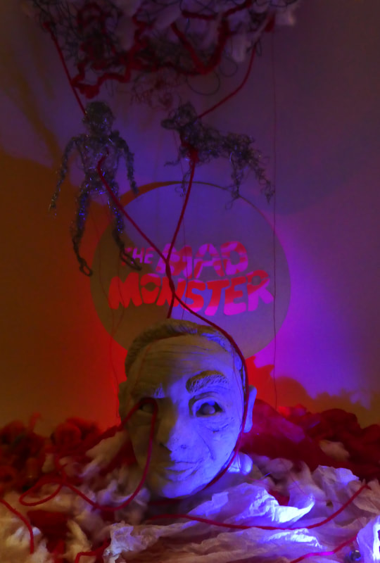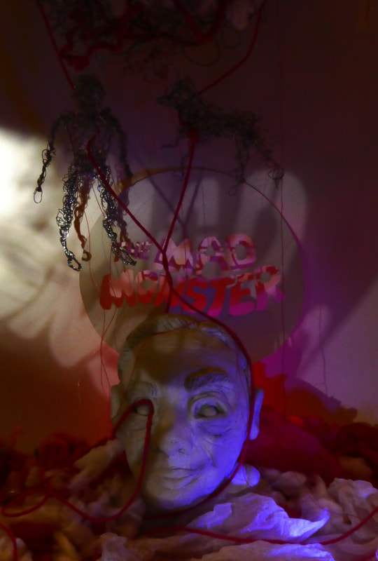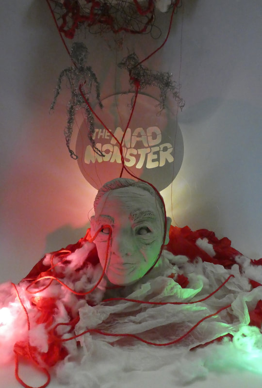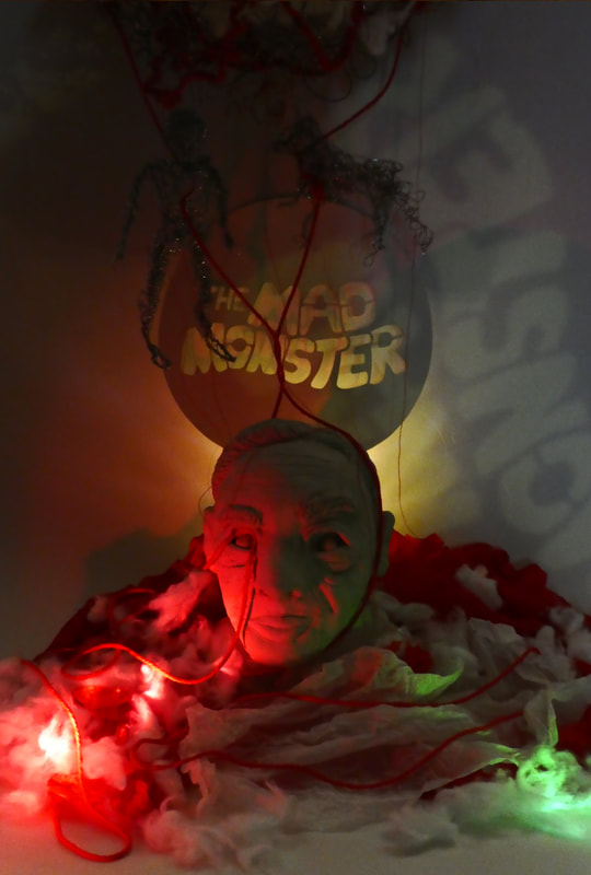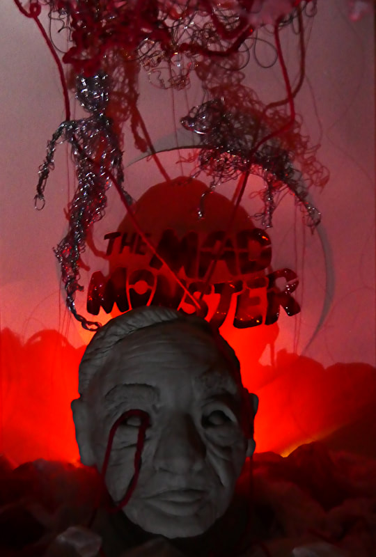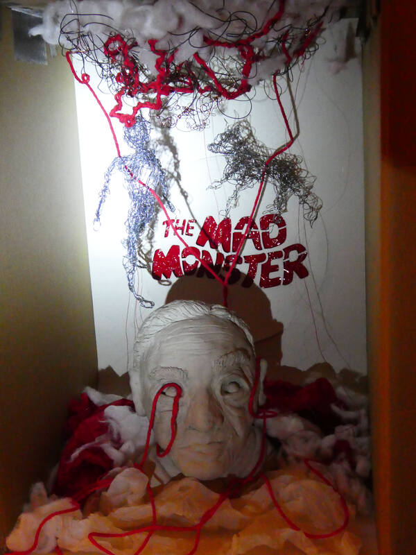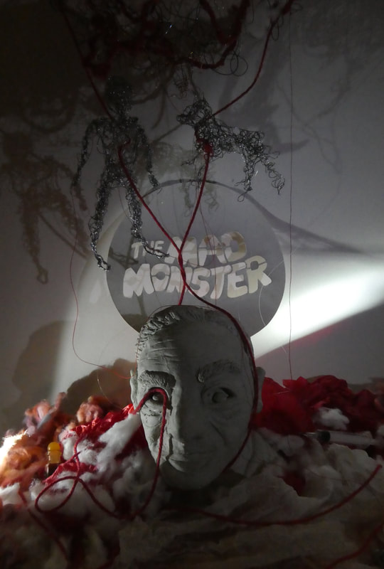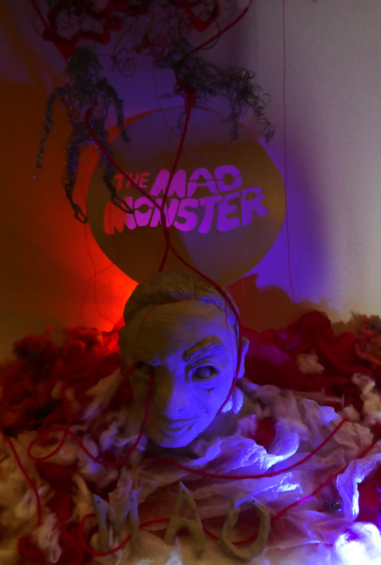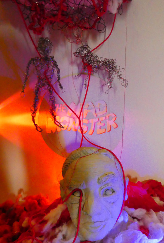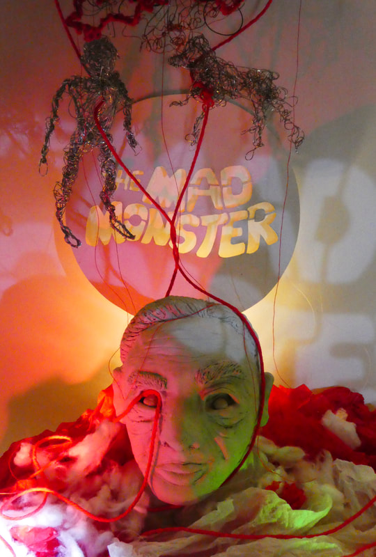 Final Poster I have selected this photograph as my final piece, unfortunately the "the" in the title has been obscured a little by the leg of the wire man. However this is still my favourite image that I have taken so far. I think that the different colours have worked well together to give the image an appearance that reflected the original "The Mad Monster" posters. I also like the way that the image is slightly messy and chaotic, this seems to reflect the mind of the scientist. Additionally I managed to create an imposing shadow behind the scientist that helps to pop him out from his background. To add to my image I decided to project the title onto the composition a second time, this has created an interesting effect that I think added to the appearance of this image. Overall I have found this 3D project to be a bit challenging, even though I did a a fair amount of testing I still found it difficult to create a whole image that could work as a poster. But I think I have learned a lot about how to work in 3D during this project. I have made some mistakes during the creation of my final piece, but I have learned from them so I will know how to make a more effective 3D illustration in the future. |