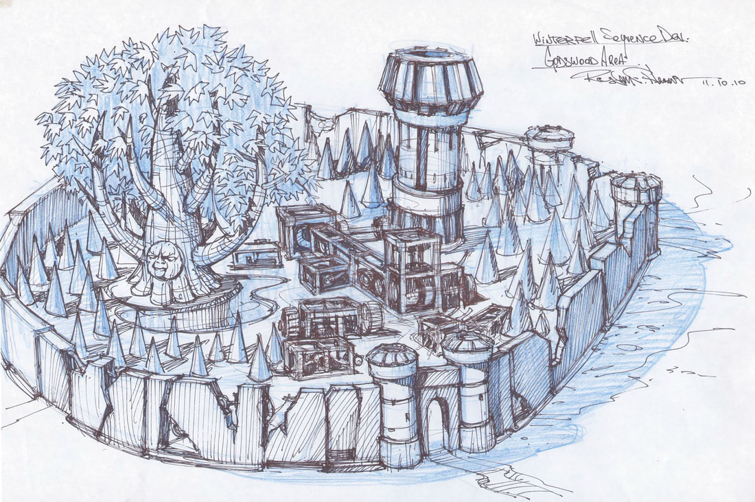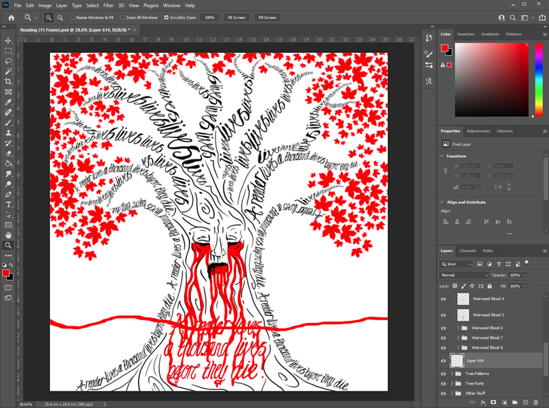 This is one of my favourite ideas that came from working with a limited colour scheme, the red, black and white is all that was needed to create the appearance of a weirwood tree.