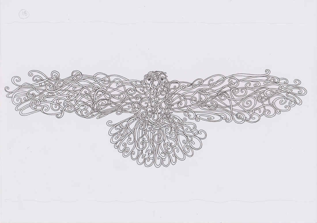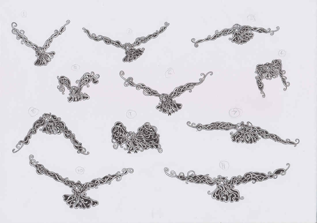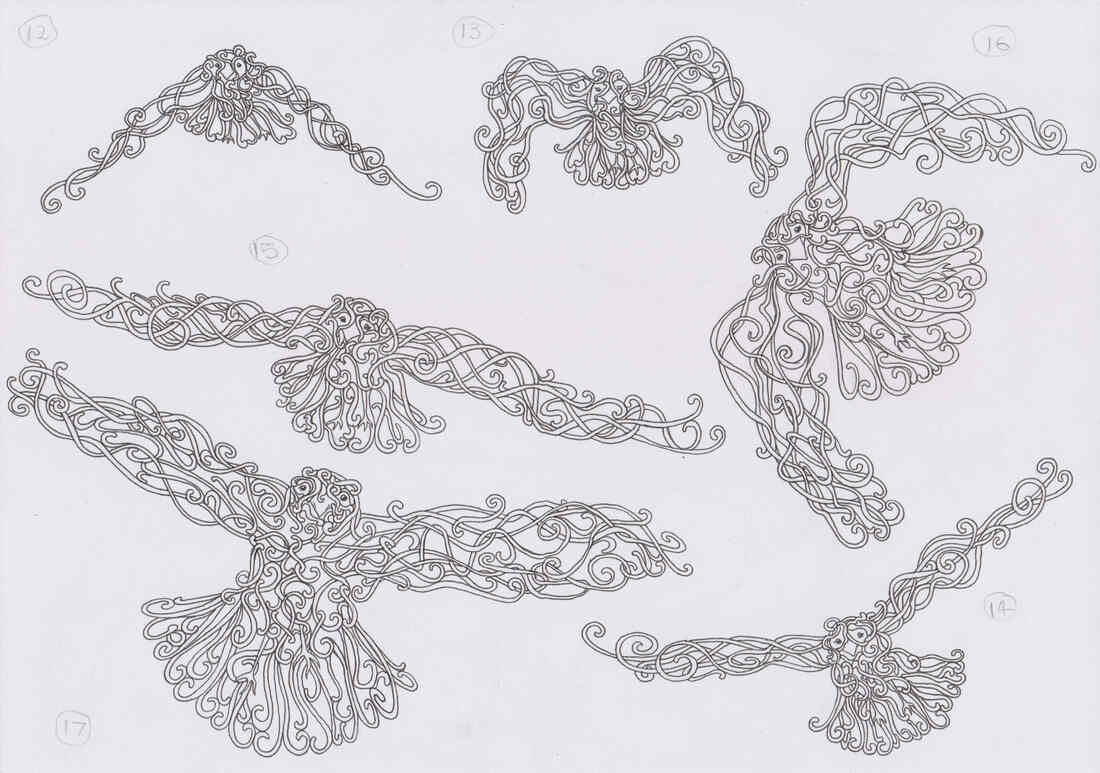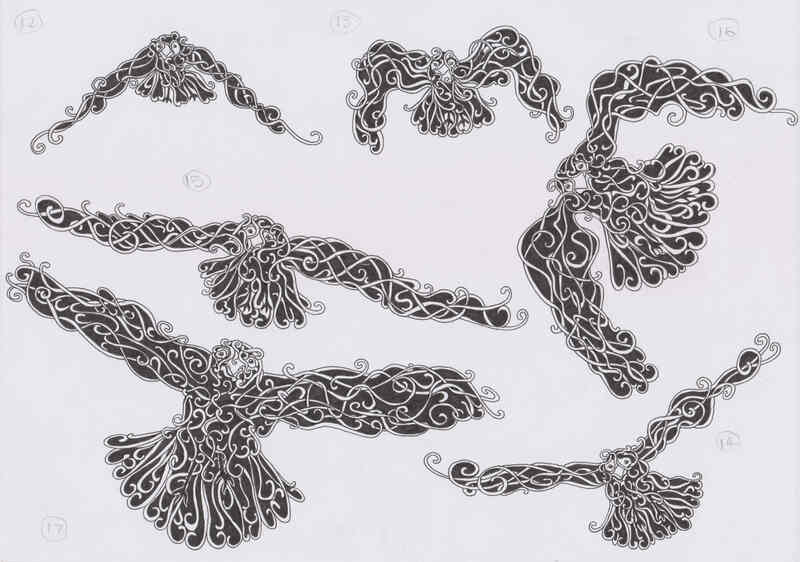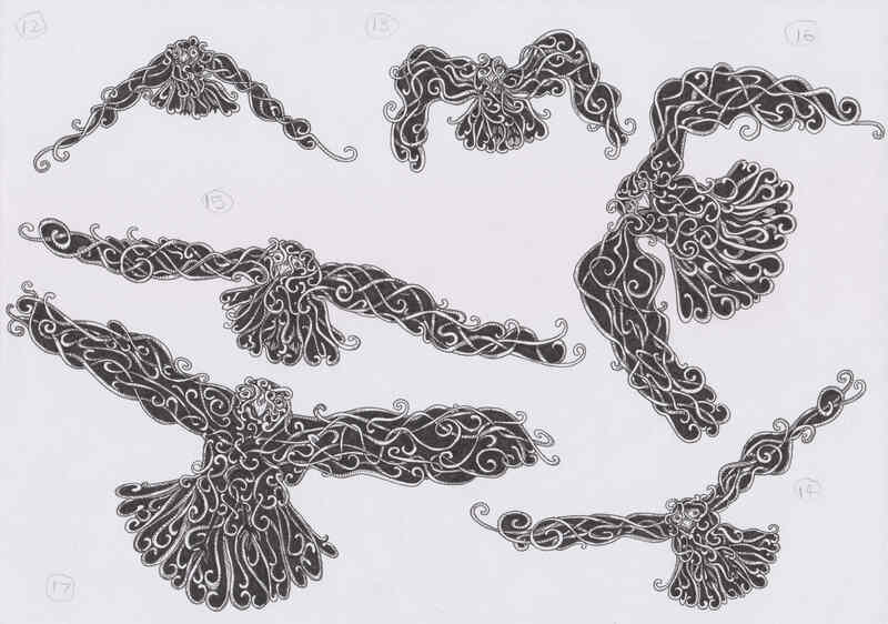 I was unsure how to start this section so I started by researching a Raven in flight, I found a few good videos to look at how flight movements work. I used one of these videos as a direct reference. After I picked the video to look at I sketched out twenty two frames to show the raven in flight and the feathers expanding at the end. Using this I am going to draw out each frame within the Nordic decorative style that I drew the boat in. |