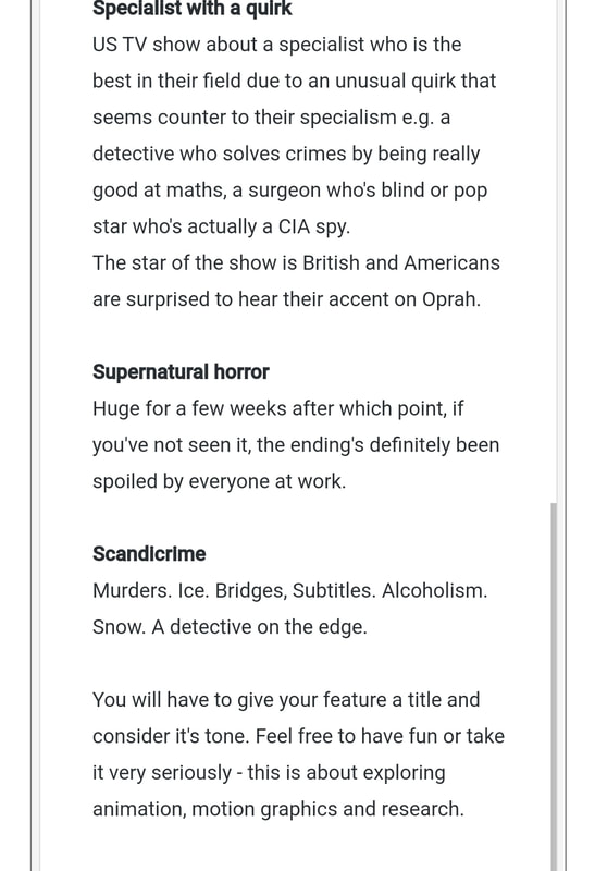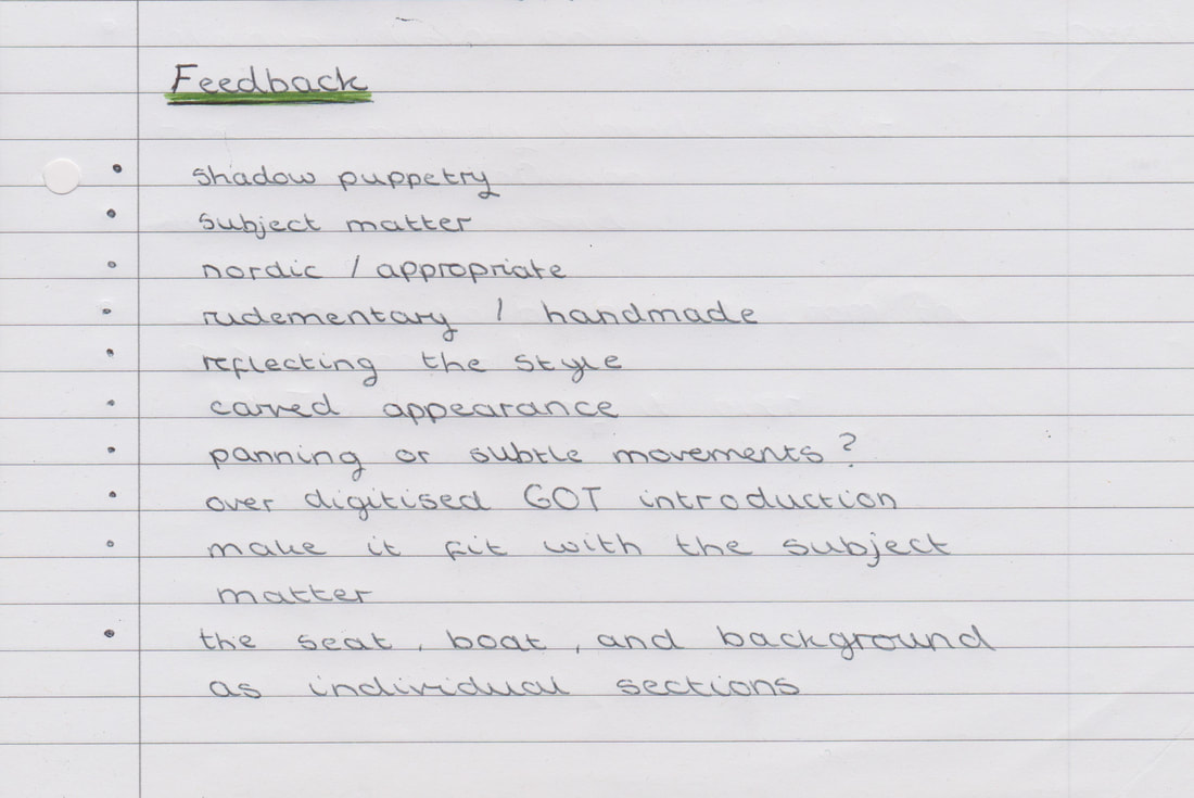 Title Sequence Feedback From the feedback that Dwayne and Jim gave me on Monday, I noted down that I should look into keeping the style fitting the subject matter like the Nordic inspired Raven that I worked on. Additionally it was suggested that I look into shadow puppets, separating the sections of the images so that I can move them around separately. I also think I should work with more subtle or panning movements instead of making the transitions smooth, because I am doing this traditionally I think that it would take for too long to animate at a high frames per second. Also Dwayne sent me two videos that relate to my project, I especially like the Noggin the Nog video. It was quite subtle with it's movements which really appealed to me as Vikings wouldn't have been able to create advanced digital animations so I think it would be interesting if I respected that and tried not to over digitise my title sequence. |