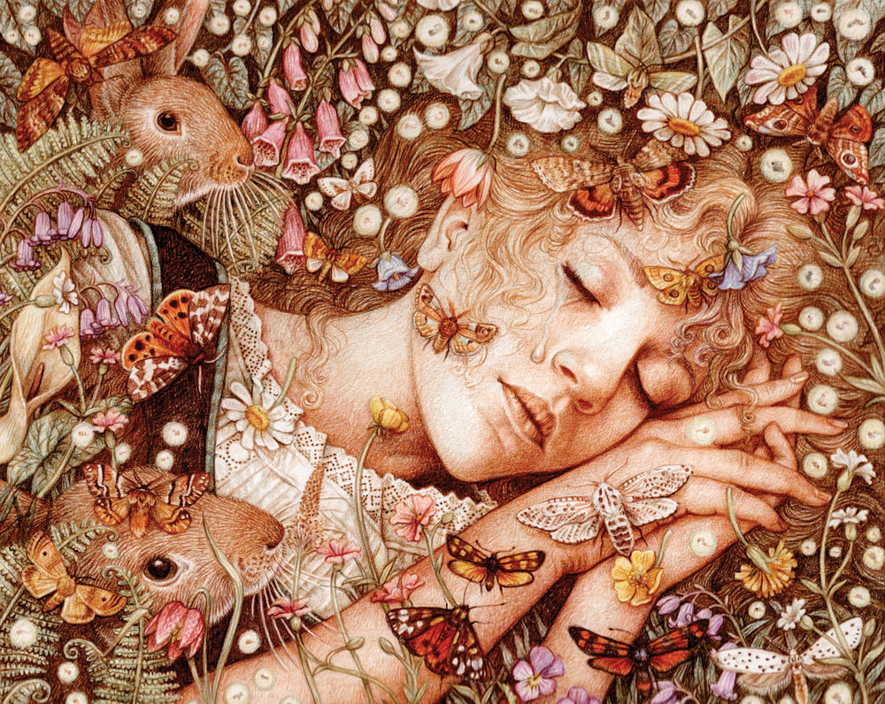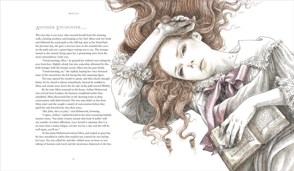 Anne Yvonne Gilbert To find out about Anne Yvonne Gilbert’s artwork I read an interview called “Colour Pencil Magic”. From this interview I have learned what kind of materials this artist uses. To prepare to create an illustration Gilbert starts by doing research, then she picks out costumes and props. After which she photographs her model/s. There is also a lengthy process that comes before starting the final illustration; this preparation consists of roughs, e-mailing clients, finding costumes and props, as well as models and references. Gilbert says it takes her approximately one week to finish a moderately detailed illustration. Gilbert tends to put more focus into the subject of the artwork and takes up the greatest amount of space with the human subject and the backgrounds are less important within the overall image. I was very interested to learn why Gilbert uses pencils within her illustrations, to me pencils have always been a medium that causes me a lot of issues. But interestingly the reason that Gilbert uses pencils is because she prefers her work to be neat and clean. She is attempting to not create any texture within her artwork, using the hardest pencils and soft paper she is able to create the kind of illustration that she likes. Anne Yvonne Gilbert has used other mediums such as watercolours within other work, however instead of painting with the medium she has bent it to her will and drawn with the paintbrushes. She has actually created a whole book with watercolour called a “Baby’s Book of Cradle Songs and Lullabies”. To correct any mistakes within the finished coloured pencil drawing Gilbert will use Photoshop, however to avoid this situation she prepares lines on tracing paper which she sends away to get approved this helps to avoid any rubbing out. From the interview I learned that Gilbert thinks that coloured pencil are a clean medium, she used Prismalo Caran D’ache and Schwan Stabilo pencils because she has found that these brands have the hardest leads. Which means that you can use the pencils with a sharper point without the pencils breaking. However pencils are sometimes quite light, so she edits the illustrations within Photoshop to create her trademark style. I have found out that she tended to use the pencils on a smooth paper – however this paper can’t be shiny. Gilbert said that she uses Wiggons Teape paper called a popset weave. She has found that this is the best way to not show the grainy texture that pencils can create. Gilbert was influenced by the artwork of Arthur Rackham, Heath Robinson and Edmund Dulac. |