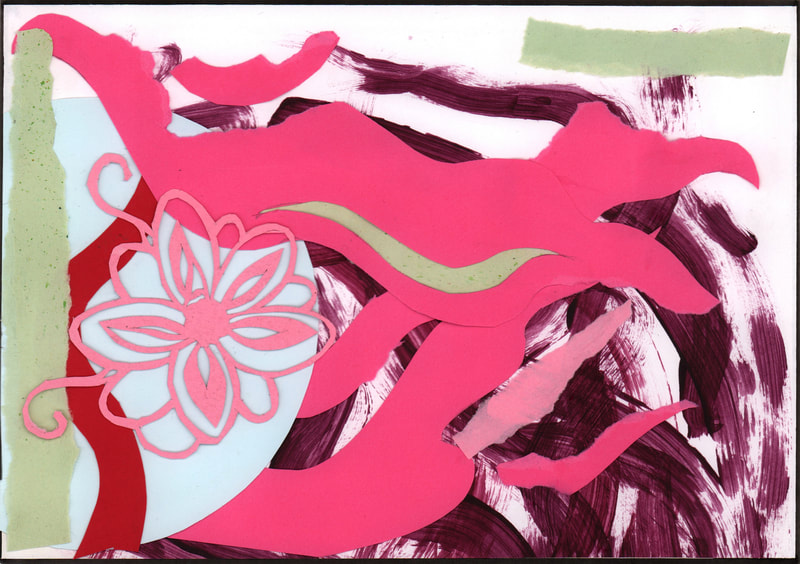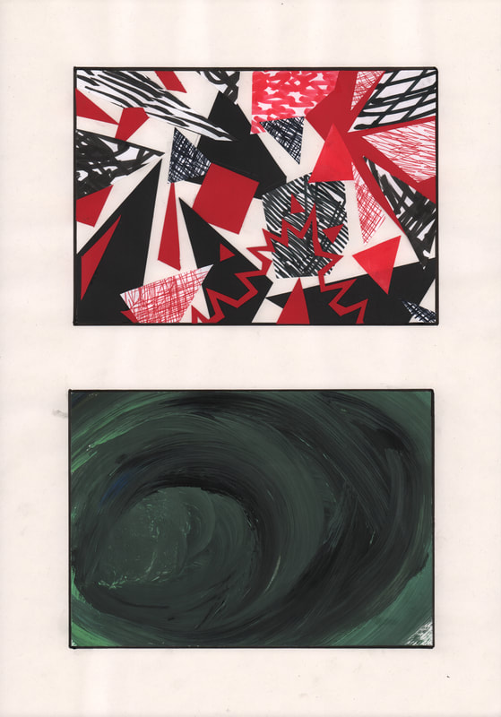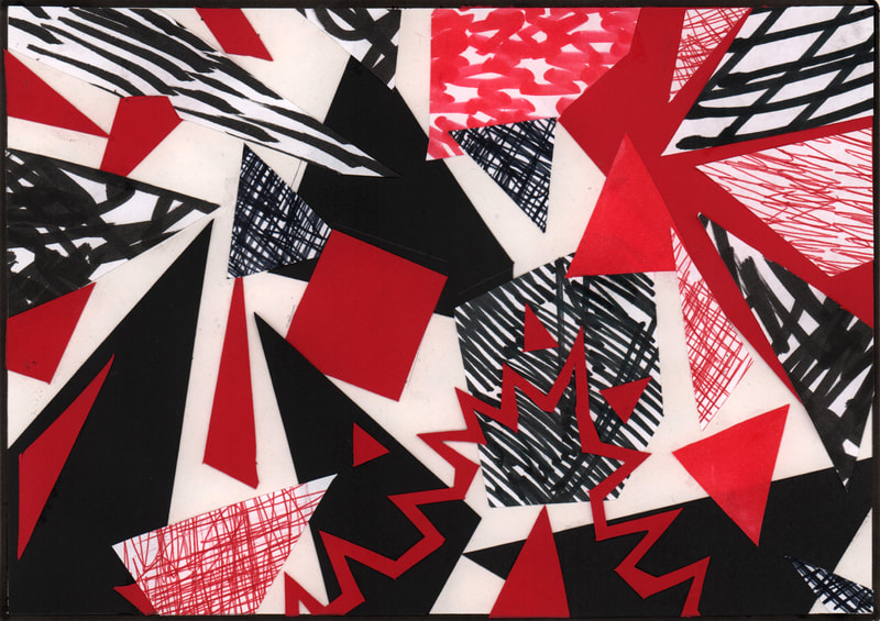 I really like how my composition for "Aggression" turned out. I created custom patterned paper using red and black pens on white paper.