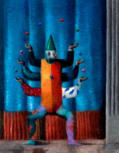 "Brad Holland uses an acrylic ‘drybrush’ technique (little or no water) when ‘scrubbing’ his paint (with a brush) onto canvas.