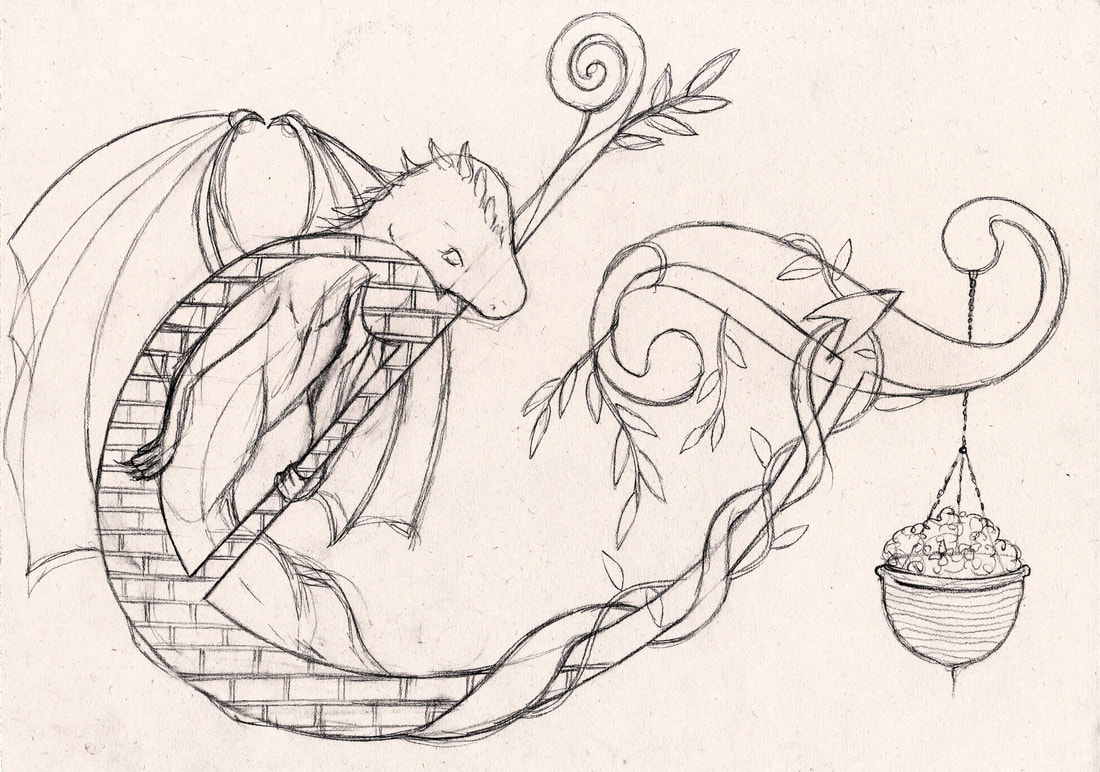 willow dragon that my mum made, the brick pattern of my house, a hanging basket and the leaves of a nearby bush.