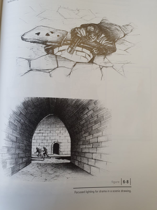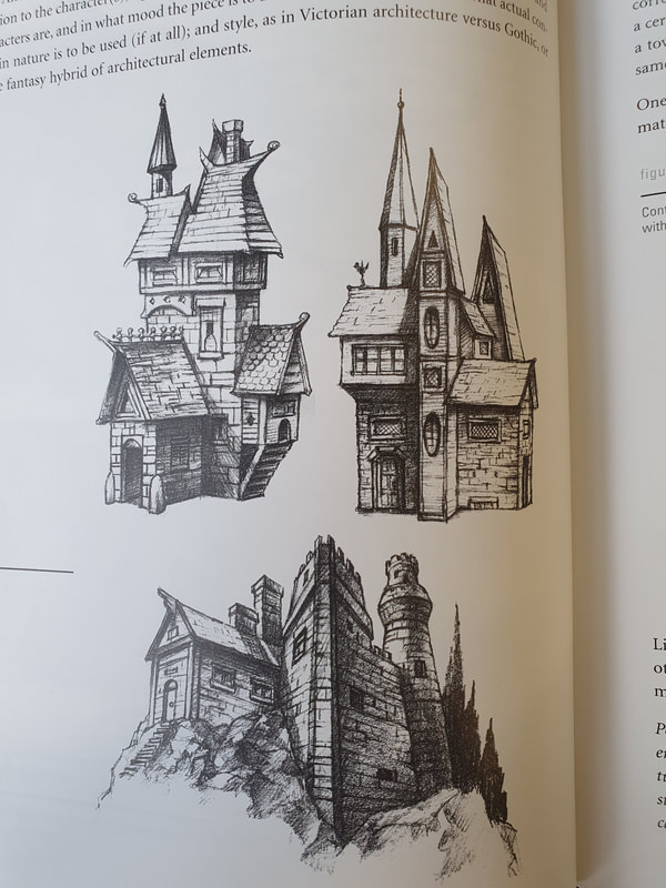 In addition to the watercolour thumbnails I used some ink to create some extra more abstract thumbnails. These weren't anywhere near as helpful as the watercolour thumbnails however I really liked the top left thumbnail the green lines remind me of some kind of magical emerald castle which inspired me into thinking of a castle design.