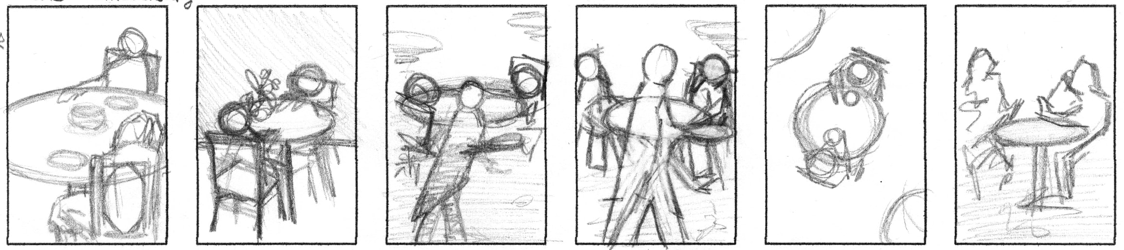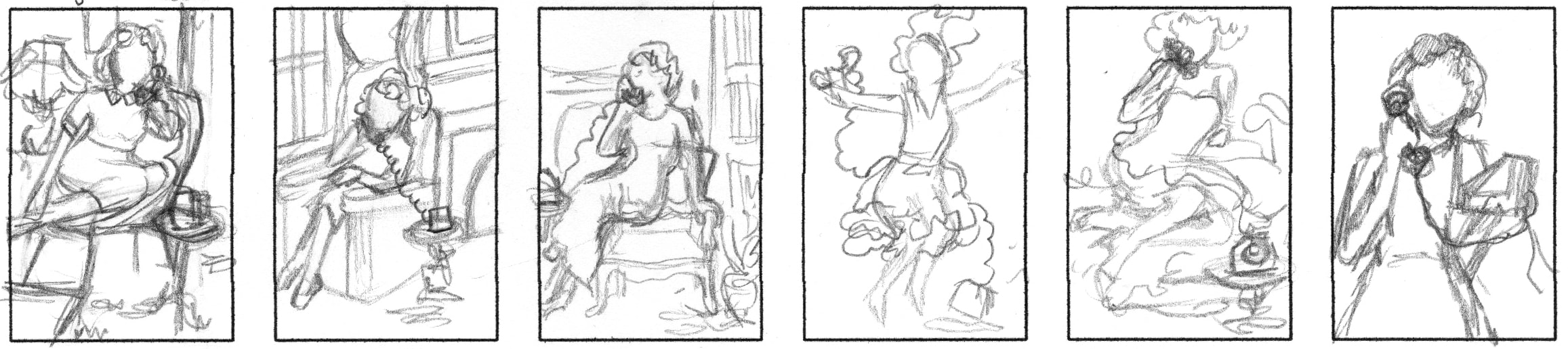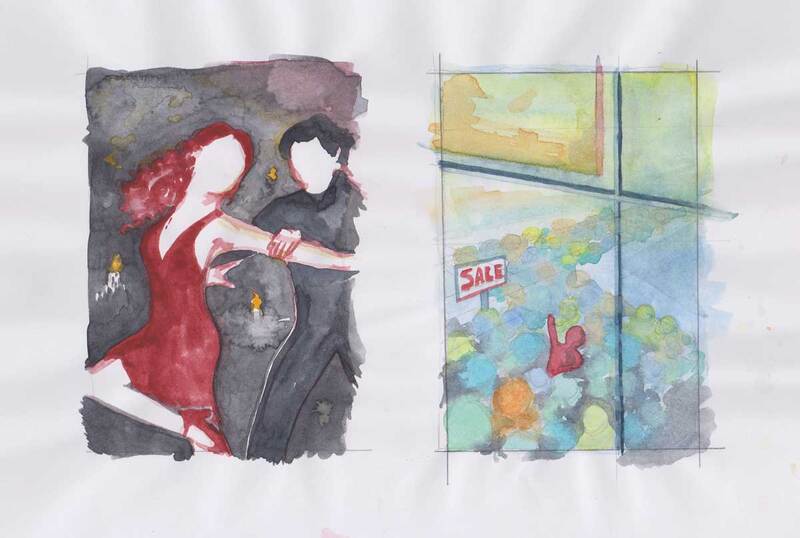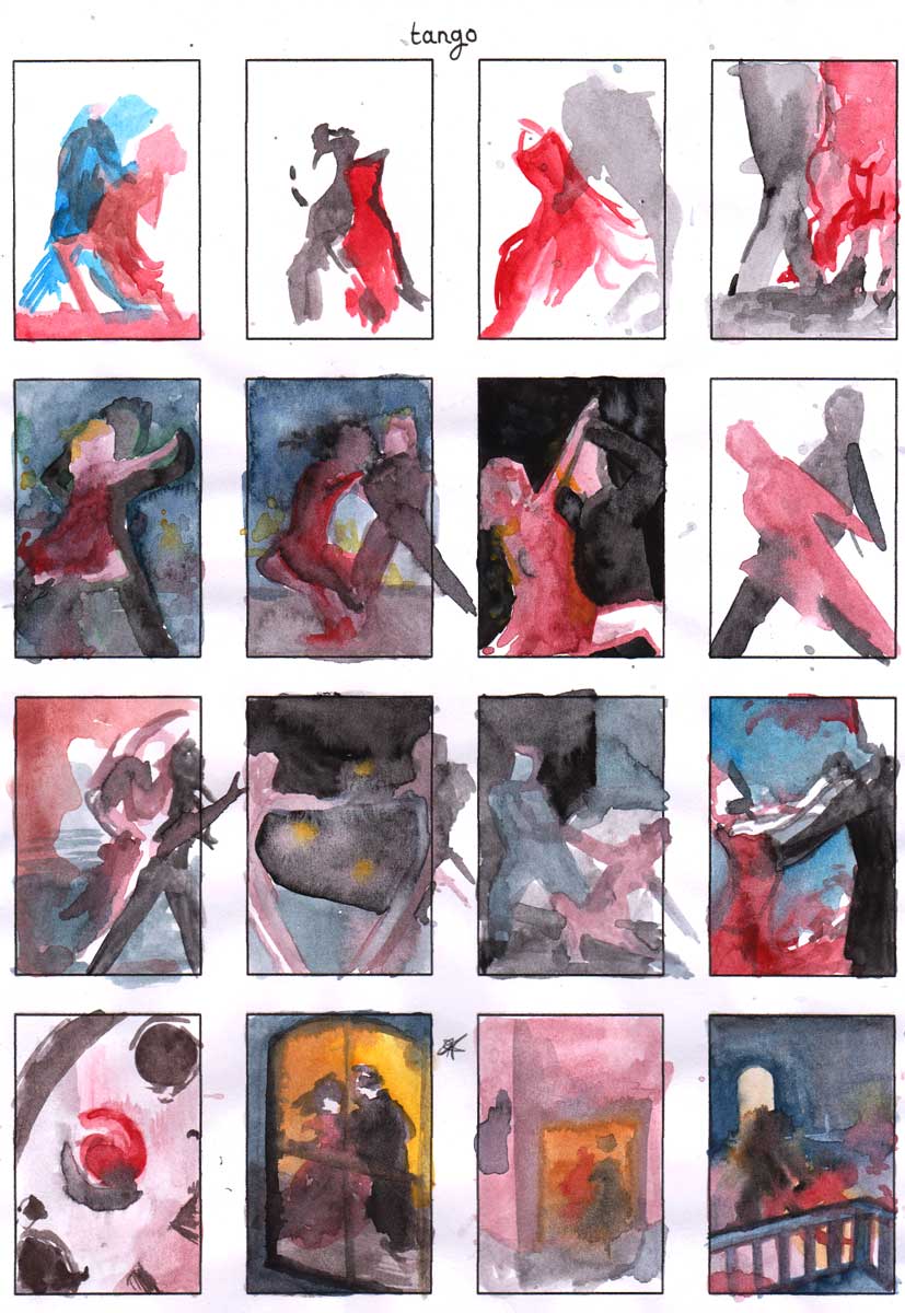 I created a collection of thumbnails for each of the action topics to get a feel of how each movement could look, I found the extra stage directions the hardest to follow. However I am very happy overall with how these thumbnails turned out, I attempted to use multiple different types of materials to create these thumbnails dependant on what I thought matched the action best. Using watercolour for the tango theme really brought the thumbnails to life.