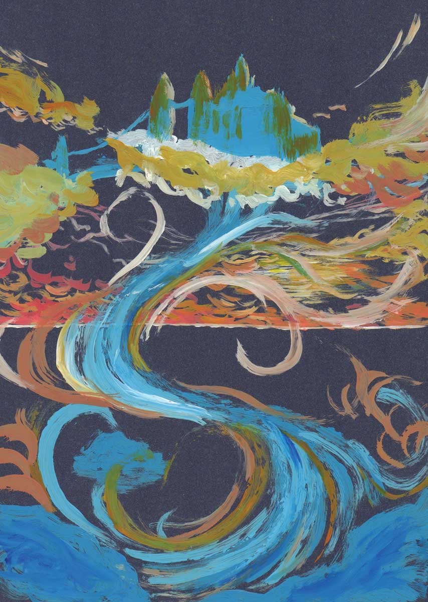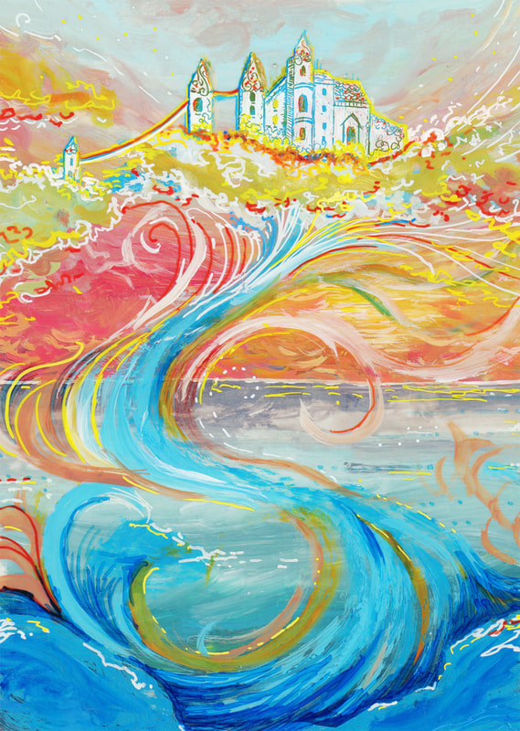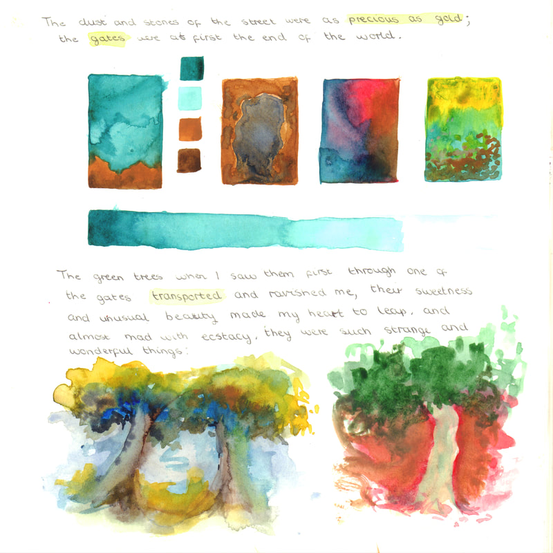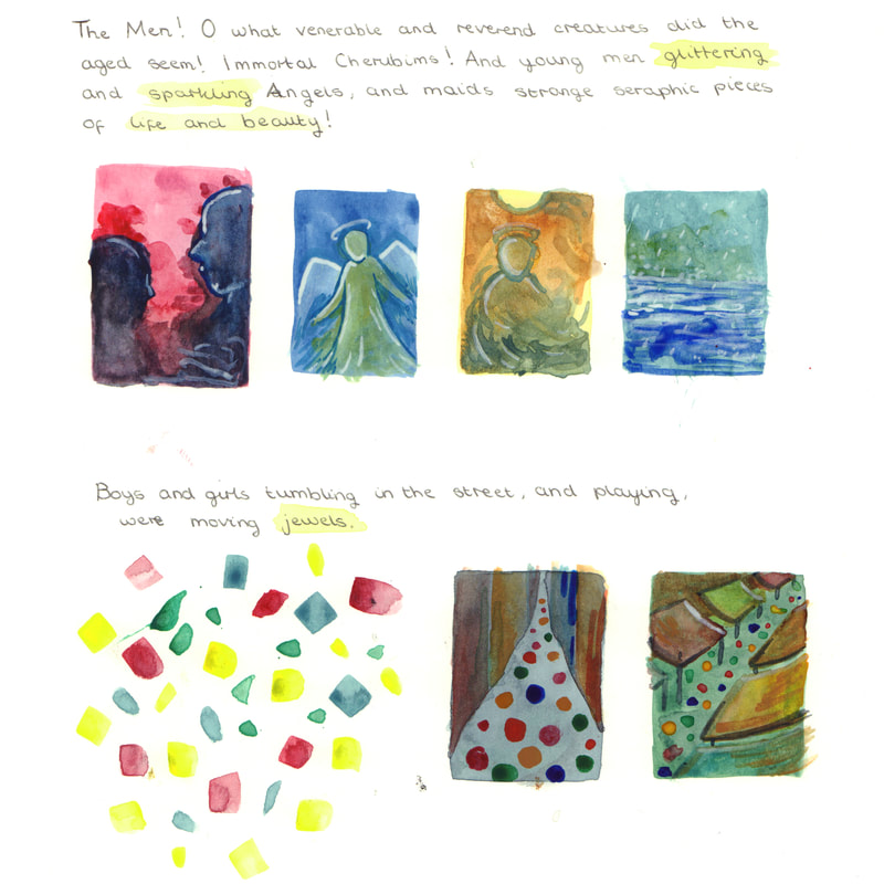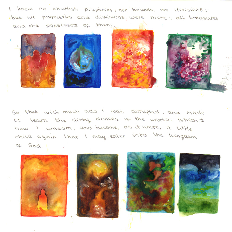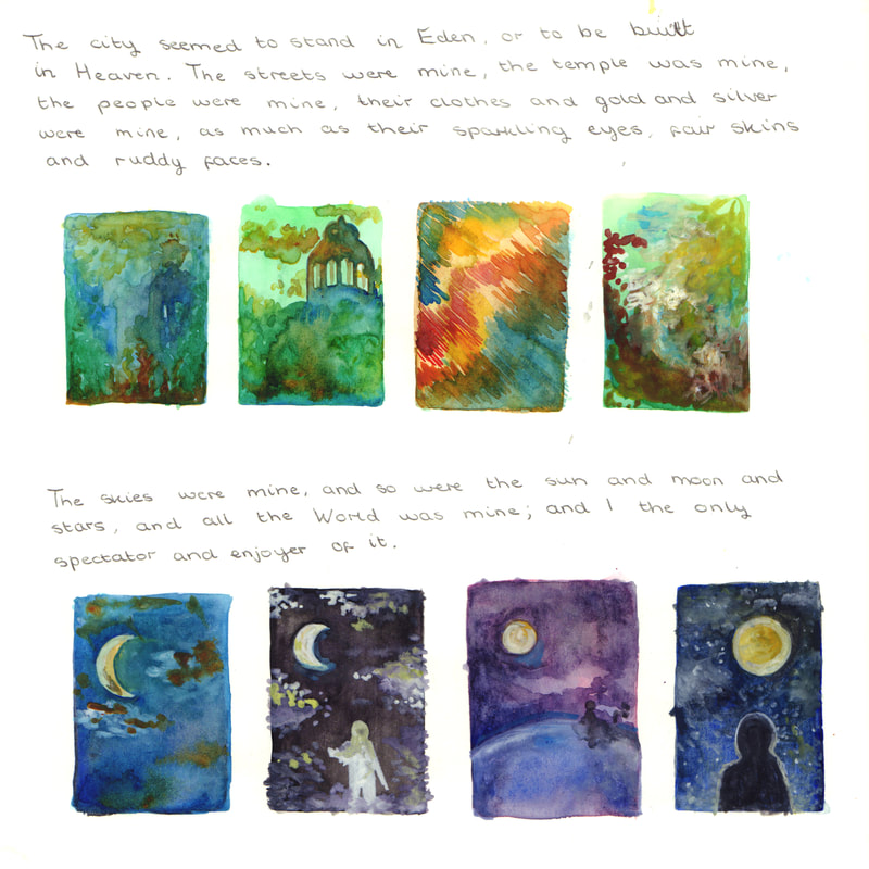 Watercolour Final Piece Before my feedback with Dwayne where it was suggested that I use some acrylics. I had already started to create a watercolour final piece inspired by my impression of the text, I really like how the colours look and I think it has a whimsical dream like quality which I think reflects the nature of Thomas Traherne's text. I would usually work into a watercolour painting much more than I did for this piece however due to time restrains and the fact I didn't want it to look overdone and literal I stopped painting sooner than I would usually. I think the fact I left this piece quite gestural helps to make the piece seem immaterial and otherworldly, which I think helps to tie it to the original text. |