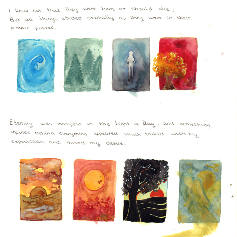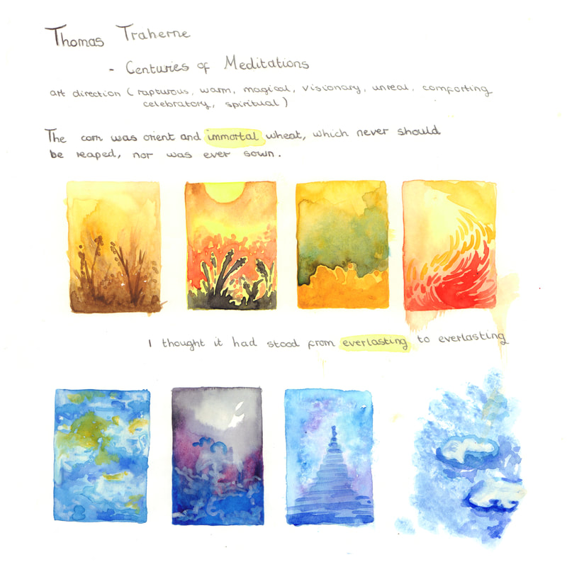 To start off this project I took each part of "Thomas Traherne's Centuries of Meditations" and created coloured thumbnails for each line of text. I loved this process because it allowed me to just play around with colours and see what kind of colour schemes came to me after I read the text. I would definitely do this again because I found it more interesting and freeing to create thumbnails without sketching the designs first. After looking at all of my thumbnails I noticed that yellow, orange and green-blue appear most frequently