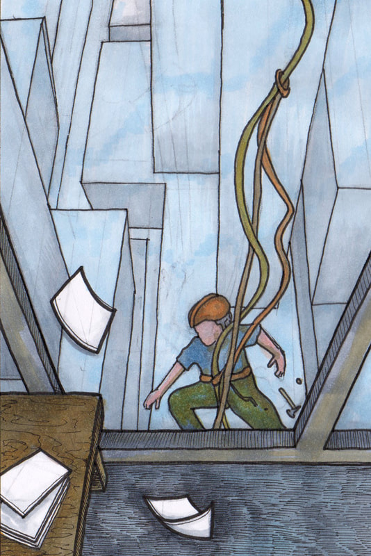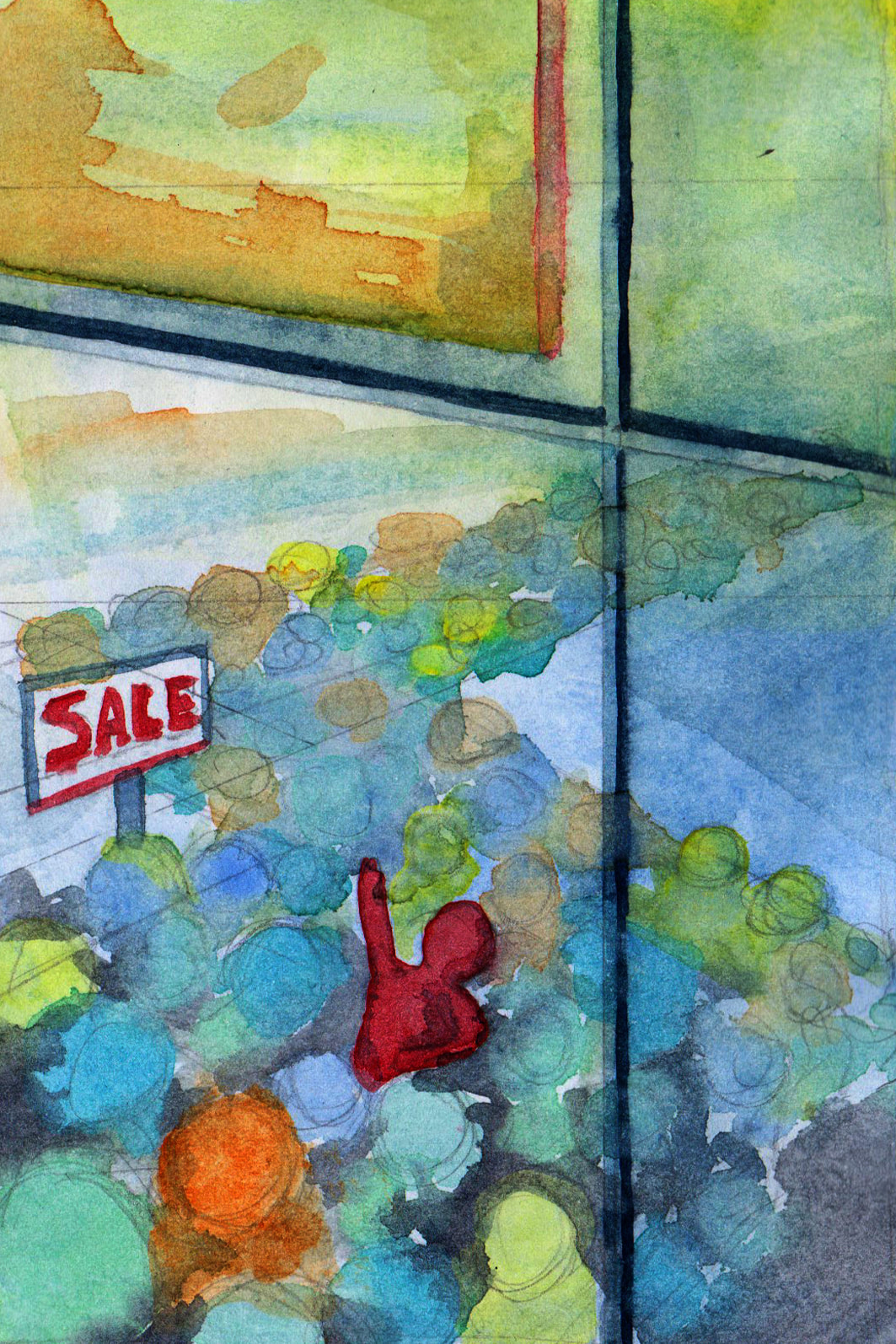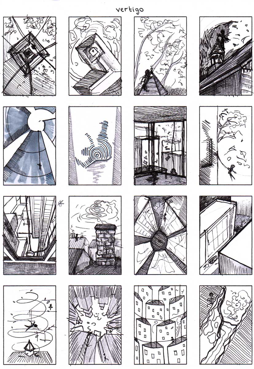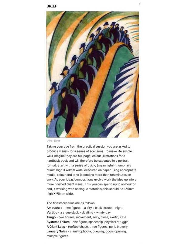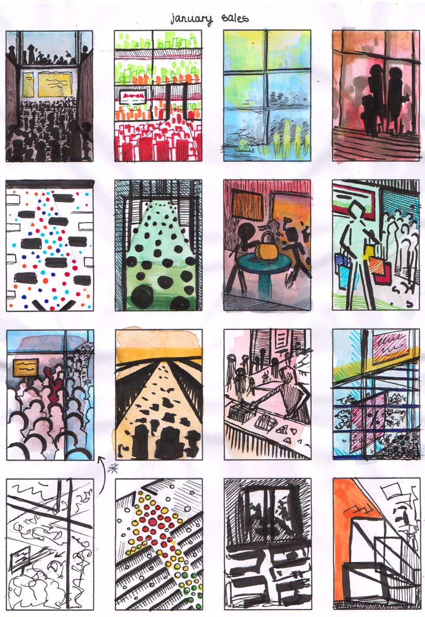 Out of all of the client visuals my favourite is the tango visual, the powerful contrast between black and red helps to draw attention to this illustration. The candle lights in the background help to add some interest too, and create the atmosphere of a café which this action scene was meant to be set within. I also liked the way the January sales image ended up looking, it is quite simplistic however I do think it gets across the idea of a sea of people sweeping someone away. Also I found the vertigo image fun to draw however I do think the colours may be too static so that the vertigo image doesn't get the benefit of the windy atmosphere which it would have benefited from greatly.