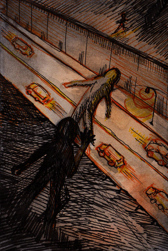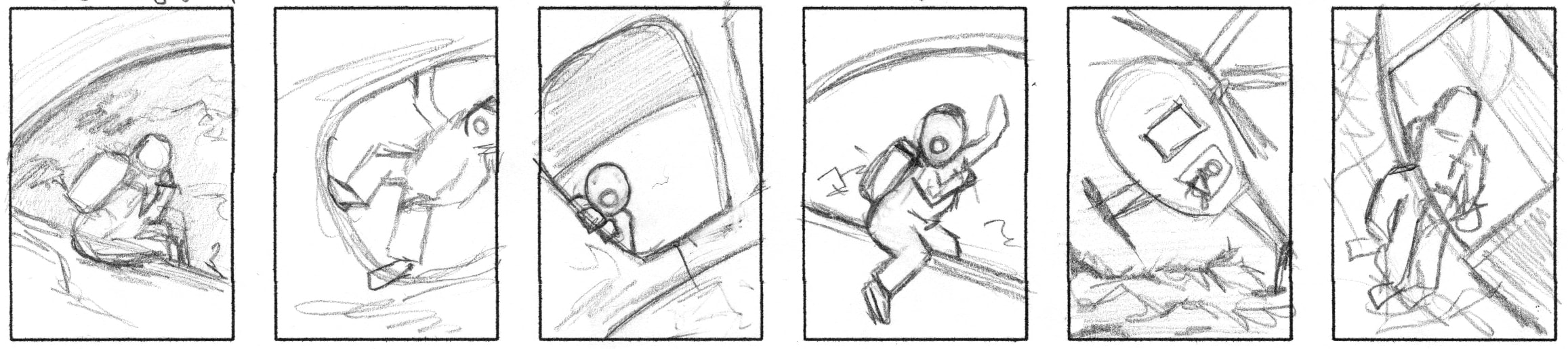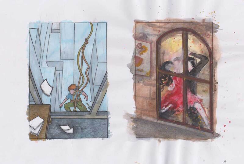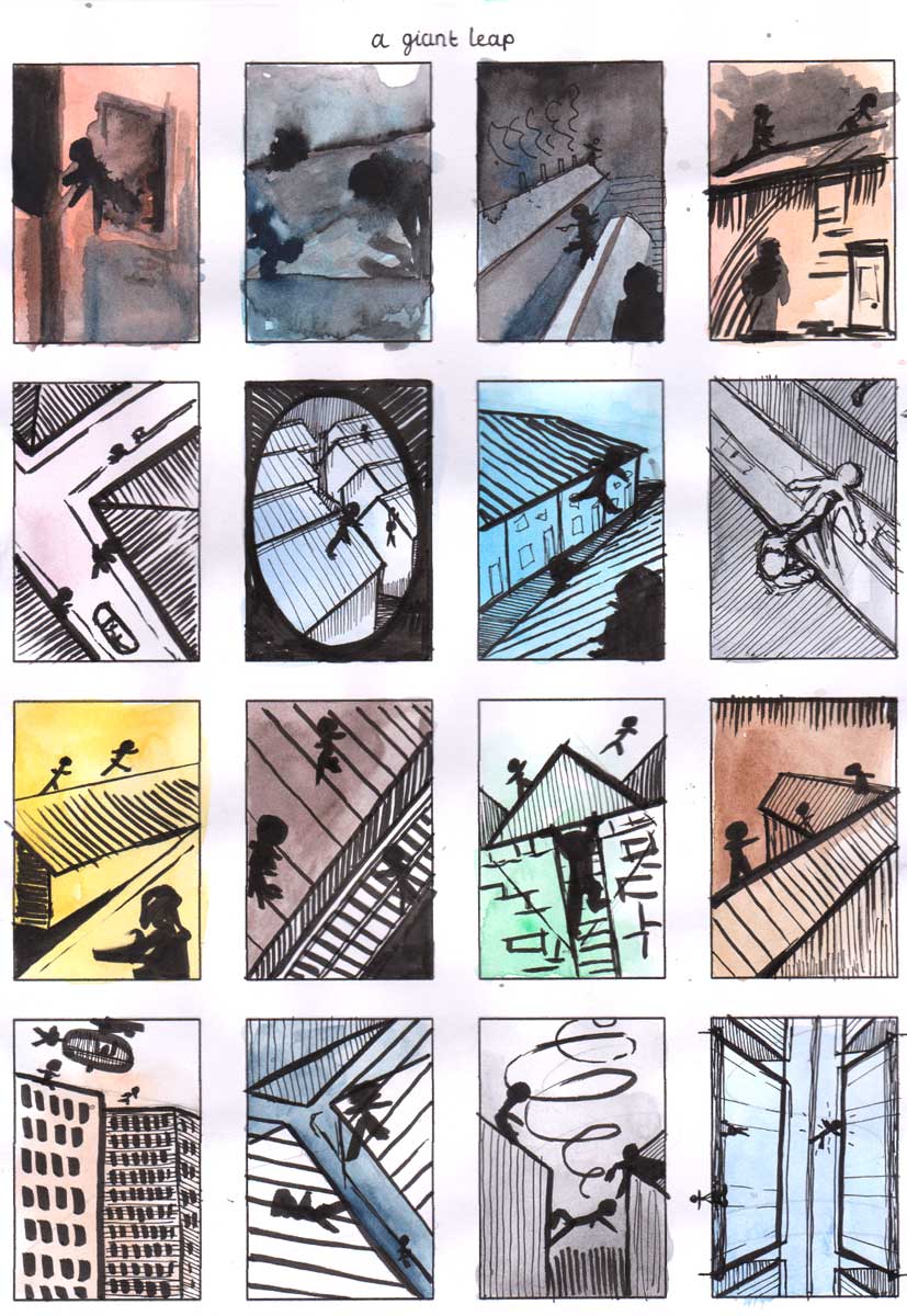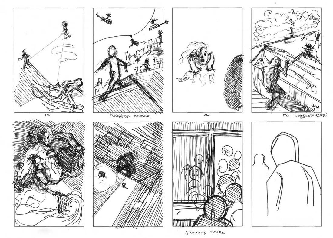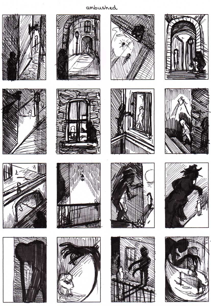 Additional Designs Created After Formative Assessment I created some more designs after the formative assessment with Dwayne, to try and show more action in the designs that I thought were lacking such as "a giant leap" rooftop chase and "ambushed" which were lacking in my original client visuals. I think these work a lot better I just wish I had the chance to develop them into more finished designs. |