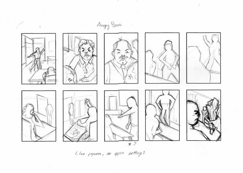 My favourite client visuals are definitely angry boss and the big jump; I think that these show off the dramatic body language best, especially regarding the angry boss. However I had to put the second figure in the background as opposed to putting them directly in the frame. I also tried to focus a lot on the colours of the the images to try and get across the concept of each of the scenarios.