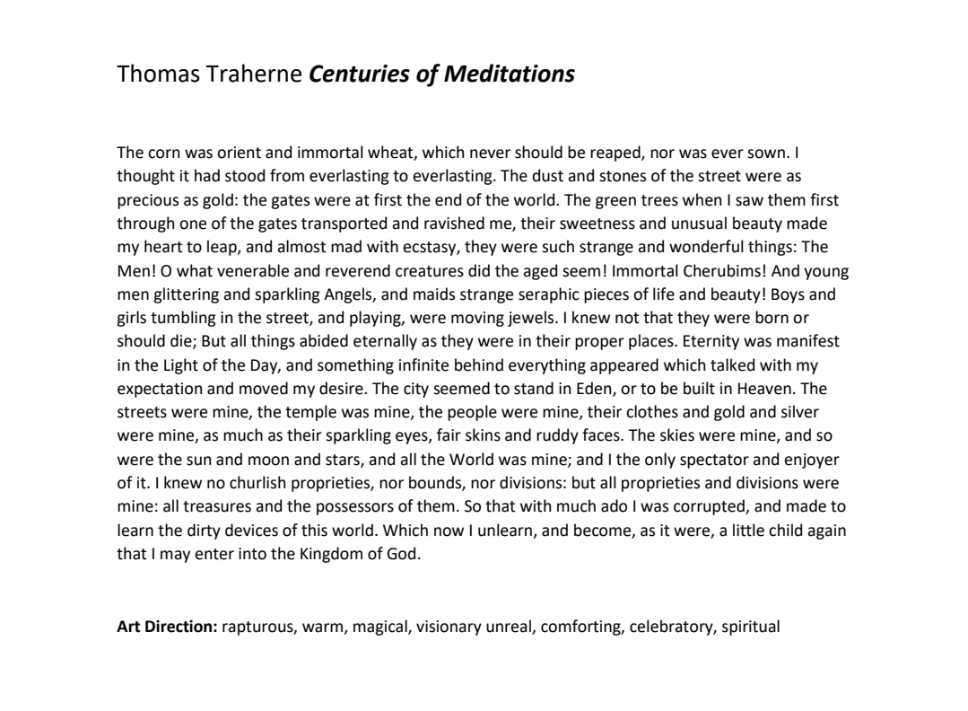 Colour Pallets During a feedback session with Dwayne we agreed it would be helpful to create colour palettes inspired by "Thomas Traherne's Centuries of Meditation" digitally. I intend to create some more colour designs, using a few of these colour pallets to colour them. This way I can pick the most effective colour combination for my final illustration. |