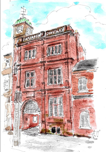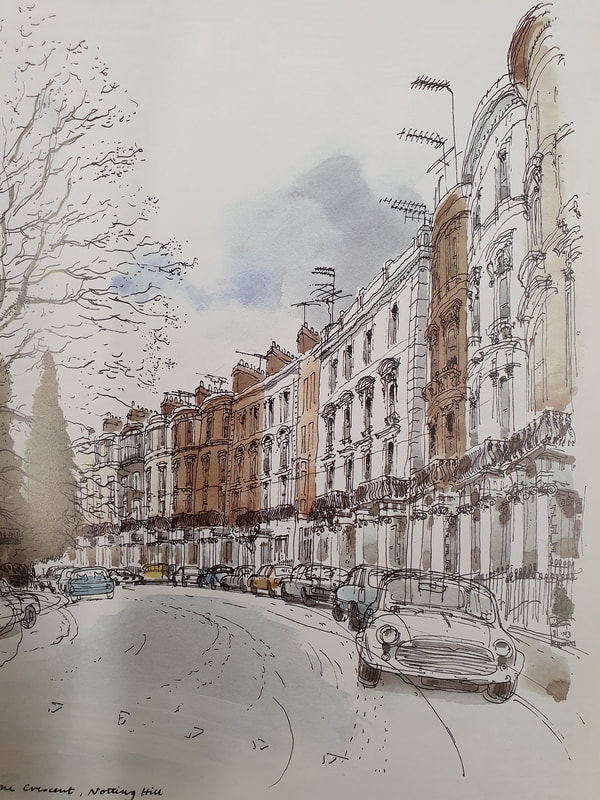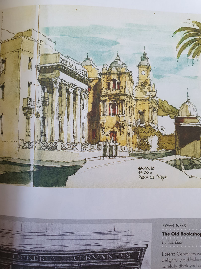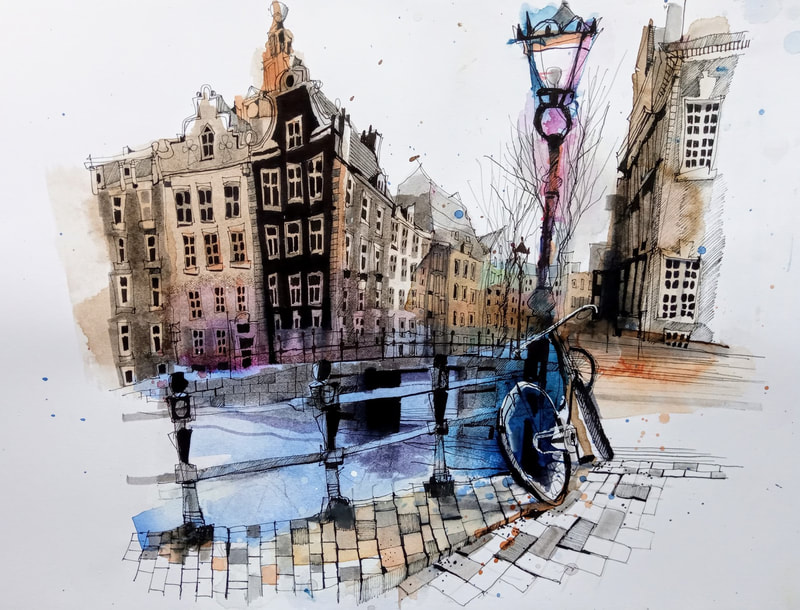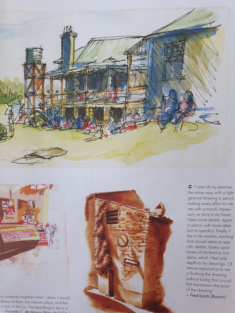 I came across Ian Fennelly when I researched Urban Sketching online, he offers classes and seems to be quite popular and i can see why. His use of colours are utterly astounding and really help to give each of his sketches a personality. I have read on his "about me" page that he starts with a wash of colour then builds up, ending with a fine liner for details. Each sketch takes him around 2-3 hours. This bright and bold style is something I want to try out in my own sketching practice after I have had a chance to get used to fine liners first.