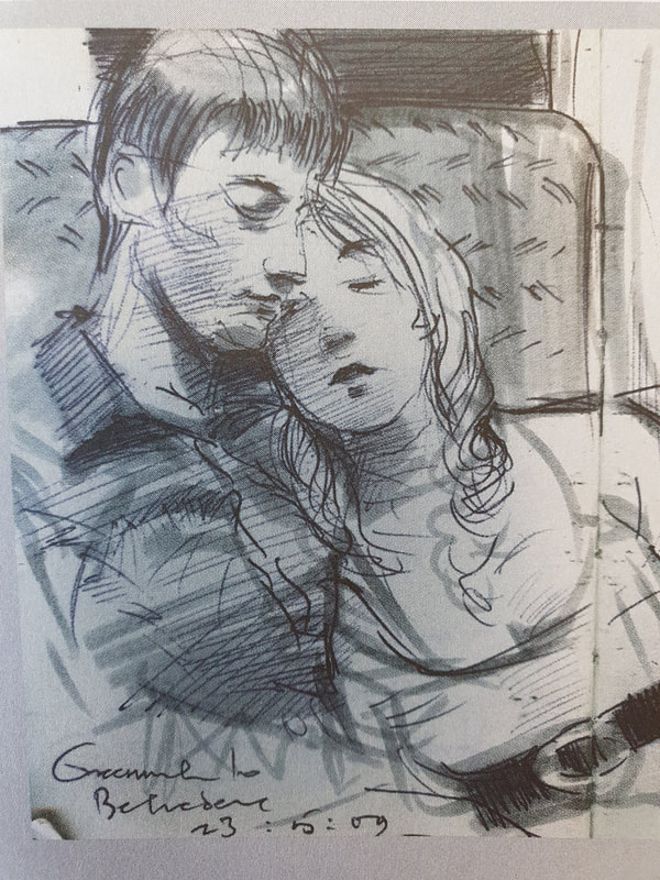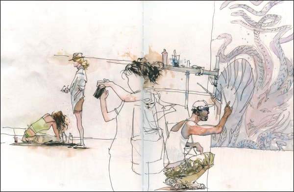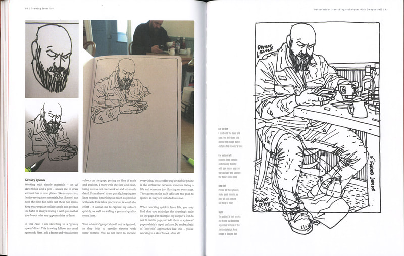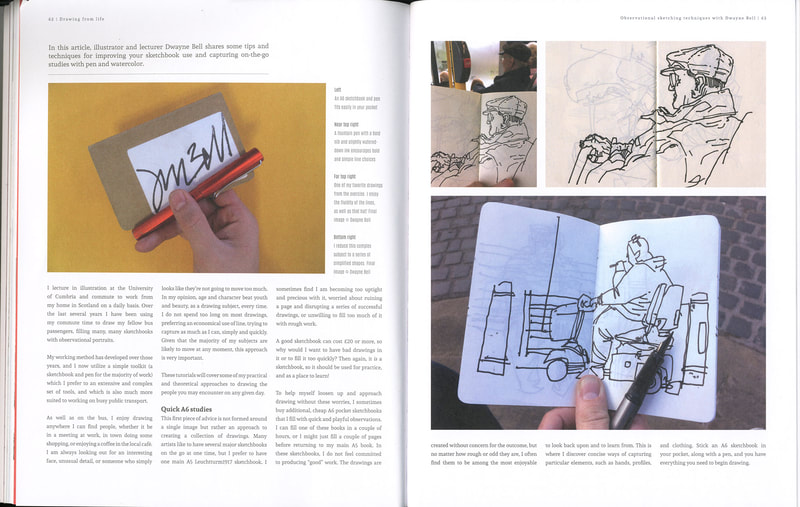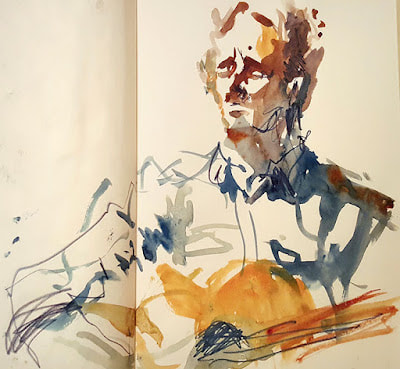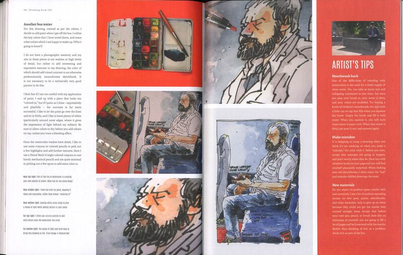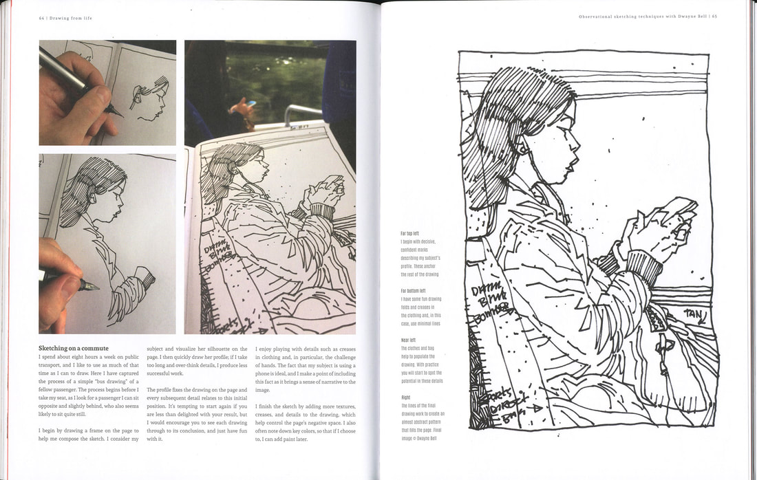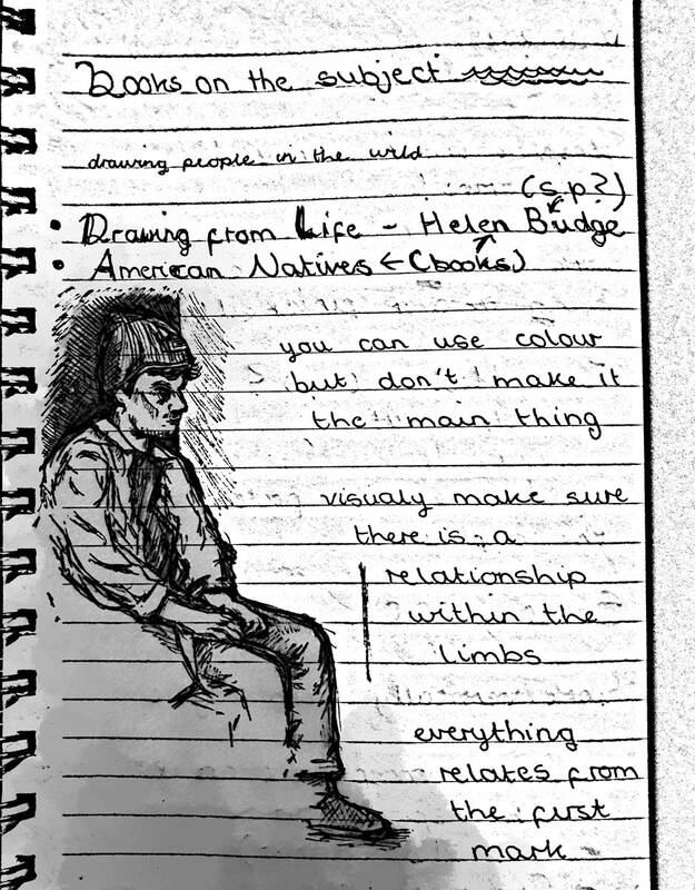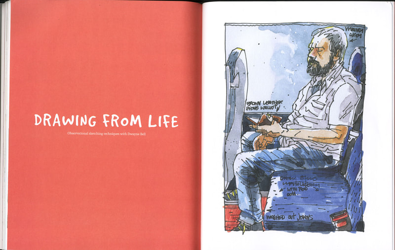 Dwayne uploaded these book pages onto blackboard and they were very interesting to read through, I especially like the sketch of Jim or "mostly grey" as he is also known. I like the way that Dwayne uses the watercolour paint to enhance his sketch but not overpower it. The way that Dwayne works is also interesting because he is working with the motion of the bus and not against it, the motion of the lines just add to the personality of the sketches. Which gives the images a slight feeling of movement even though the subject of the sketch is stationary.