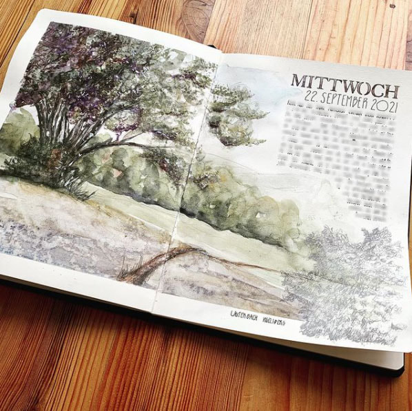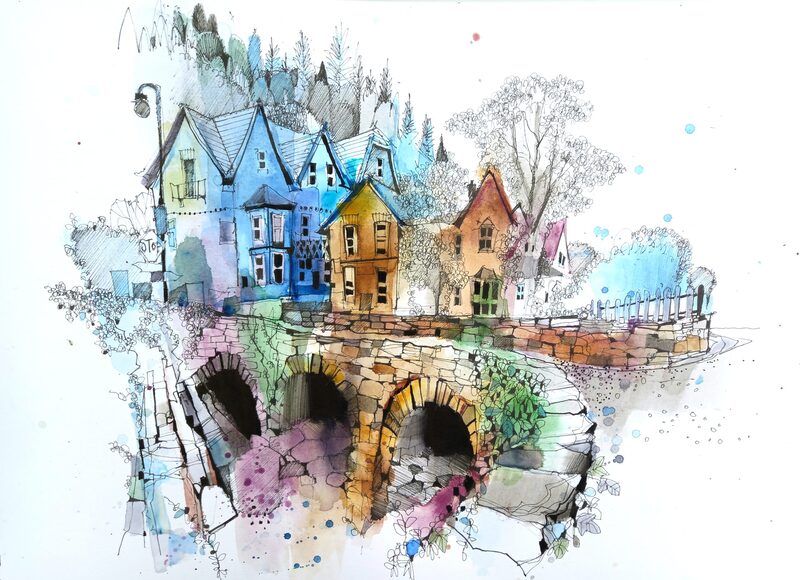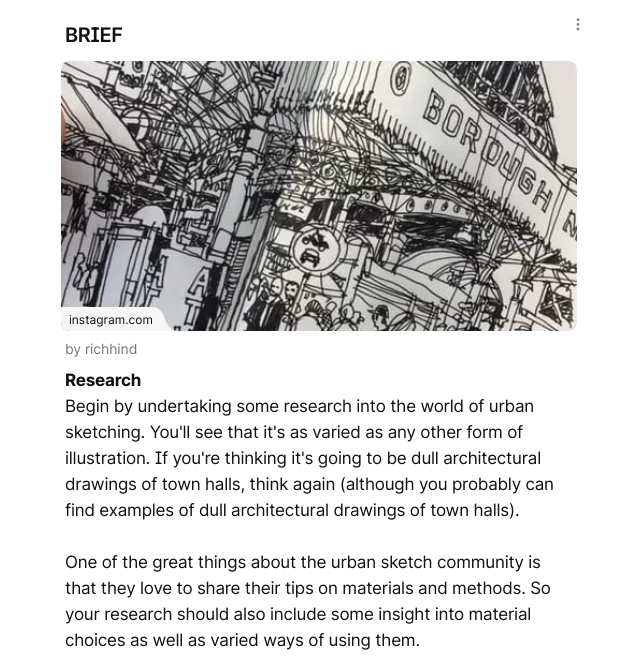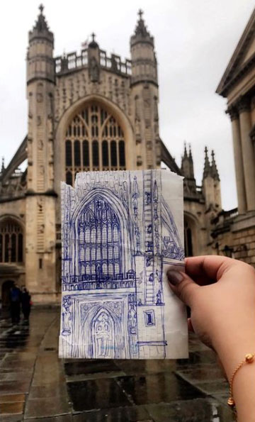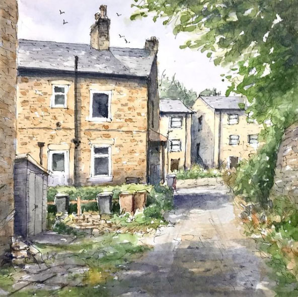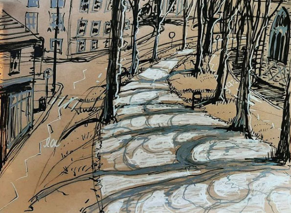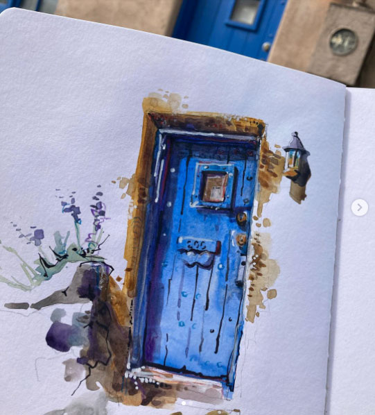 I also when to Instagram and Google to find examples of different styles of urban sketching, I seem to be mostly drawn to the colourful pieces. Especially blues, the door and building just stand out to me so much. I also loved the coloured pencil drawing of a man on the train, the overlapping lines of colour really help to give the man some character and I also think this technique gives the appearance of movement too. I also found a very helpful blogpost about sketching in the rain, I thought that was an essential thing to find out when I am planning to sketch outside in Cumbria.