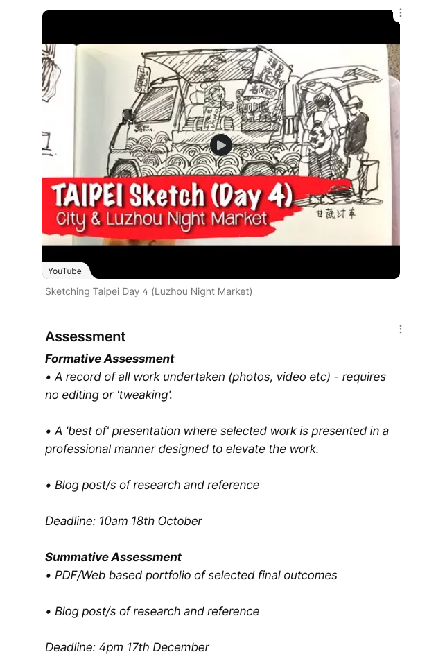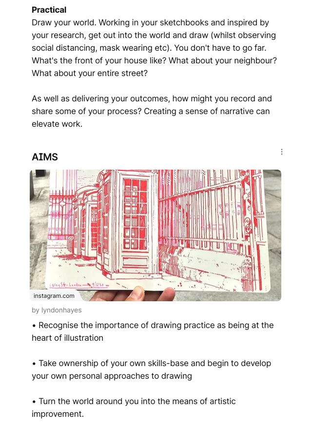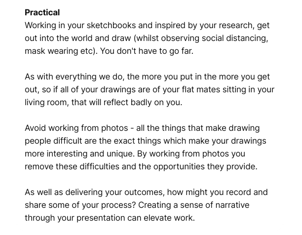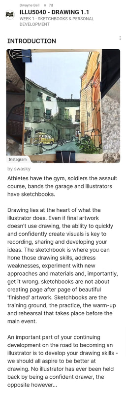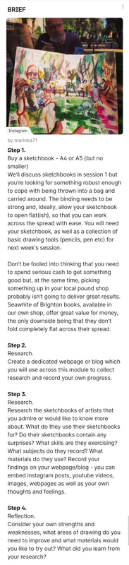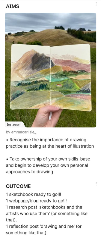 To reflect on my own practice and what I want to work on within this project I would first have to start with confidence. Throughout this project I would like to work on my confidence when sketching; I am perfectly fine when sketching at home or in Tullie House, because in those places I know what kind of people I should expect to see. But outside in my village, surrounded by people who know my name and would want to see what I was doing, that sounds terrifying. So throughout this process I would like to start to care less who sees me drawing and what they think. Also I want to work on the confidence of my lines, I generally sketch in pencil and I always have. So for this project I think I would like to work towards using pencil first a bit less. So I can just let myself be a bit more free with my sketching, like the urban sketches do. Due to the fact I only usually use a HB pencil for sketching my sketches usually don't stand out. So I want to work on adding dimension and making my sketch pop out from the page. This means I want to try pens, ink, watercolour and any other medium that would help my sketches to come to life. Additionally I don't really ever draw buildings so even that will be pushing me out of my comfort zone, which is something that we need to do for growth so I am up for the challenge. To summarise: I want to gain confidence in my sketching, and become more comfortable with people seeing me sketch. I also want to try and mix up my sketching style, and the type of subject I choose. |