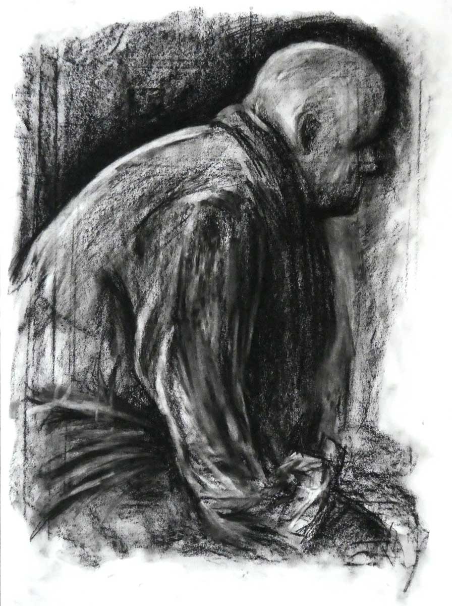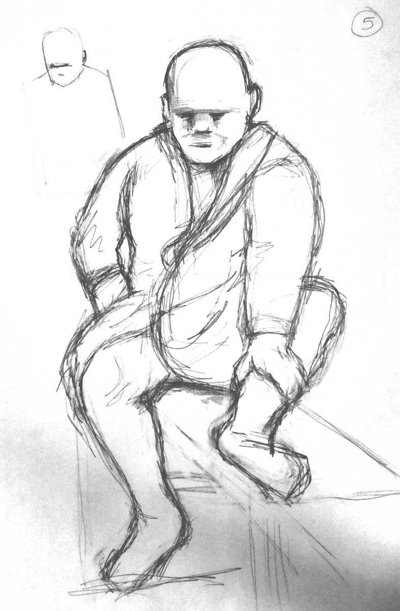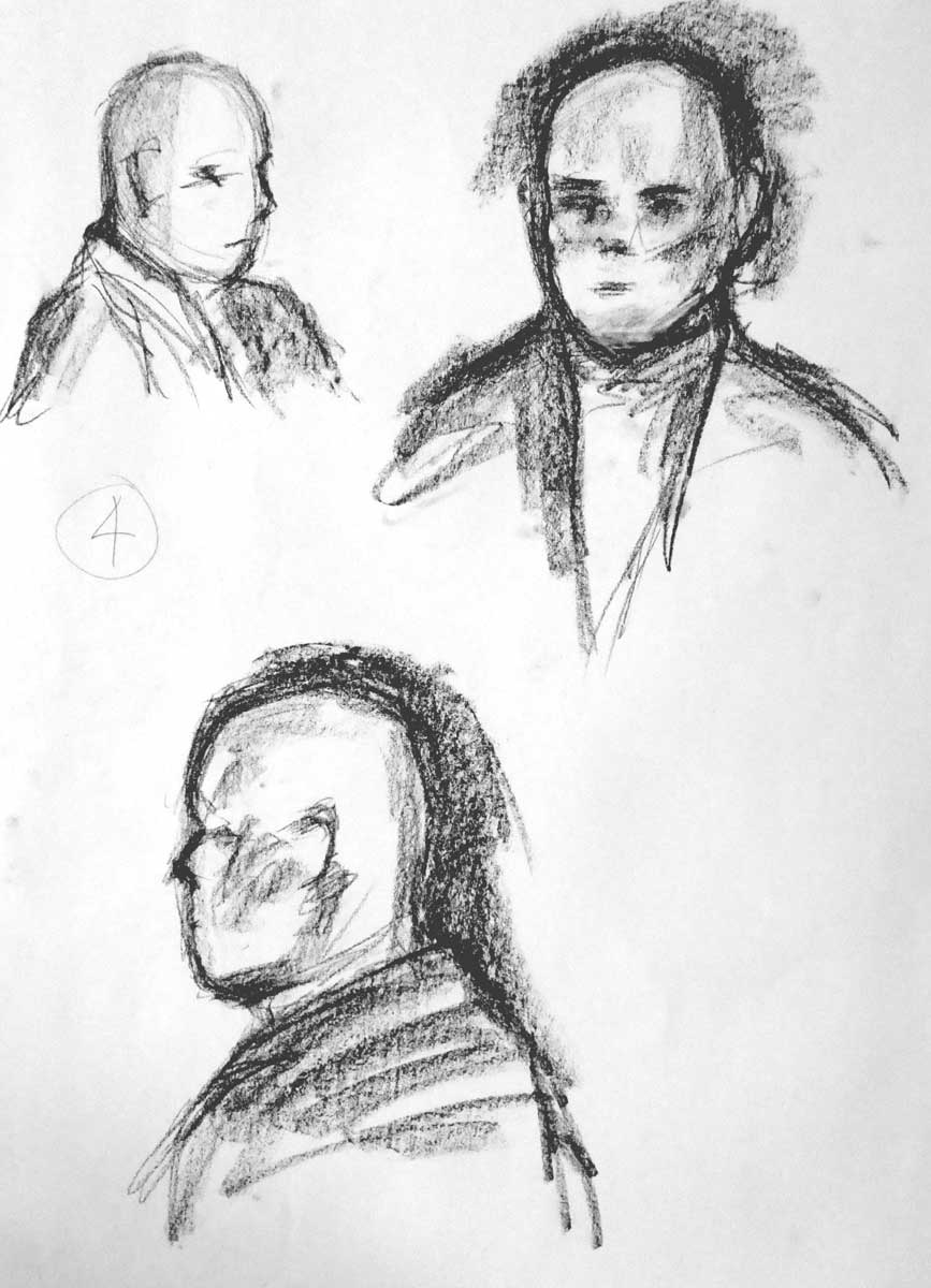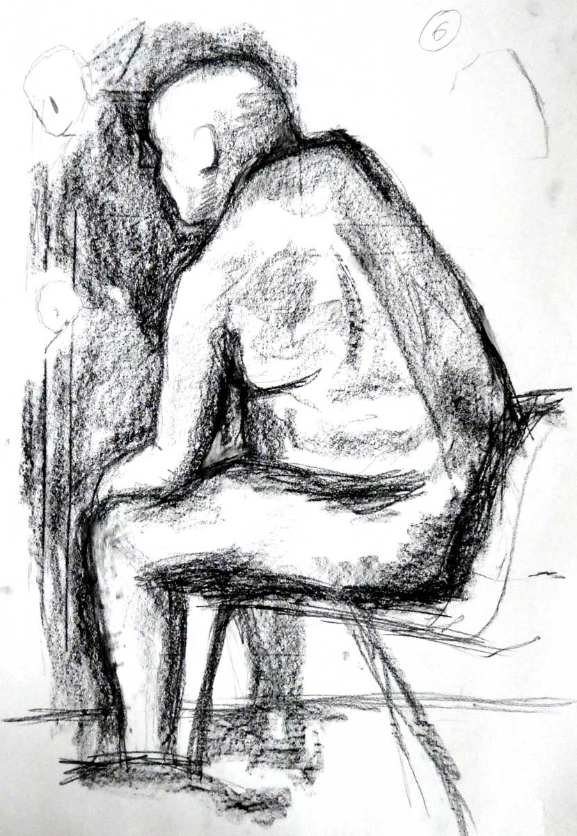 Then moving onto using a conte crayon we were asked to create a series of head studies alongside a full body poise of the life model sitting on a bench.