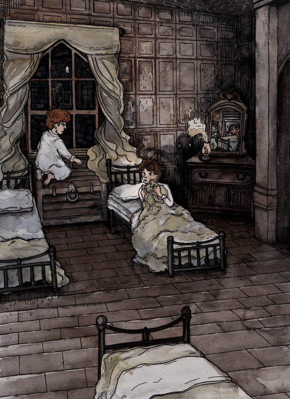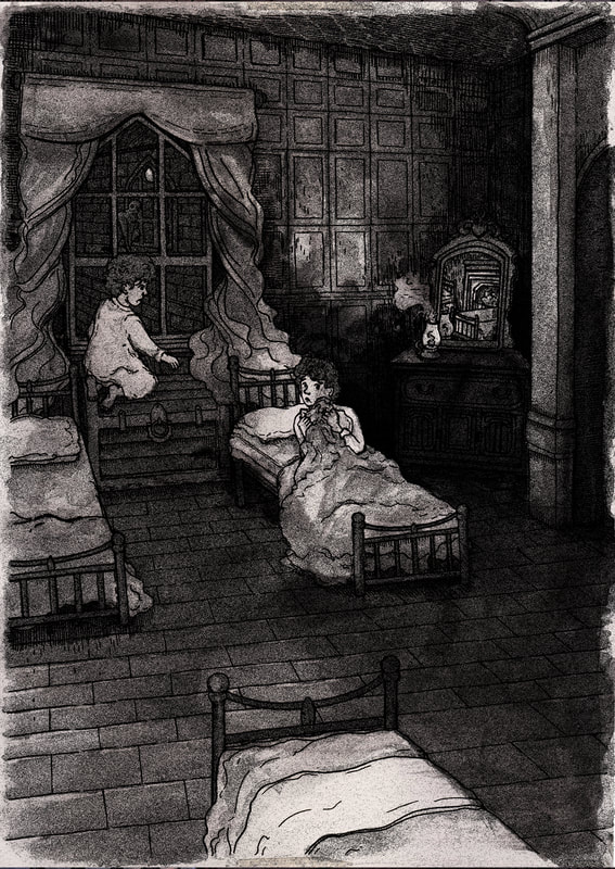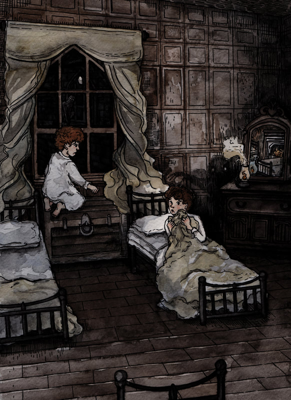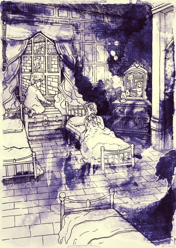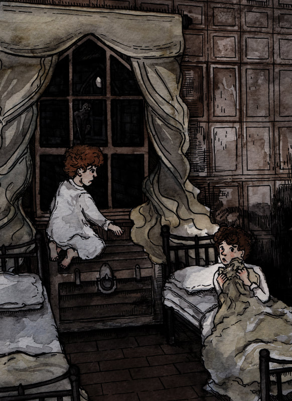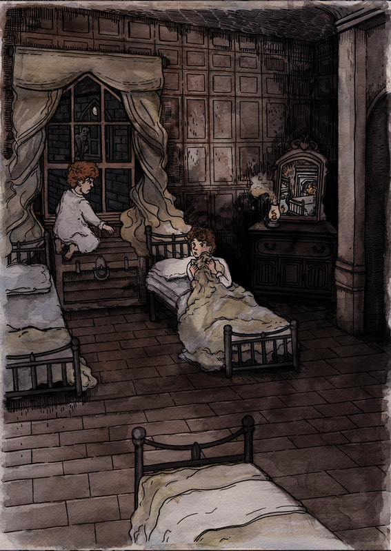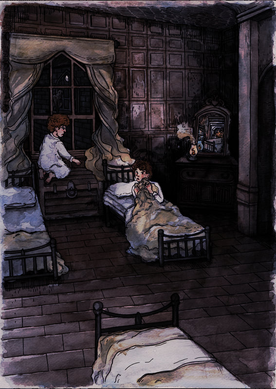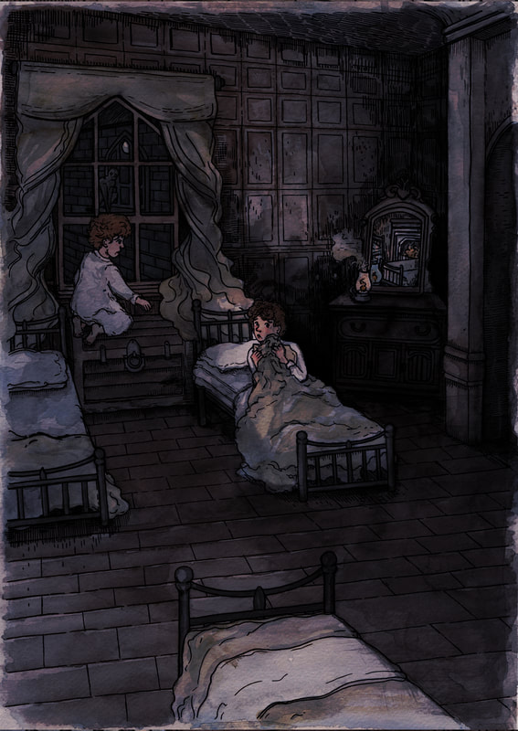 Final Full Page Illustration I like how my final illustration turned out, I think that the more blue hues in this illustration definitely add to the ghostly environment. I also tried to highlight the monster out of the window a bit more because I was unsure if everyone had noticed it during feedback. The story I was given for this project was "A School Story" by M.R. James, this is a story based in a boarding school so I chose to create the illustration in a more children's illustration style inspired by Enid Blyton. I think that it looks good and fits well with the actual story, as the story isn't very graphically scary it is more just an environment of unease and mystery. It my final illustration that I edited I overlaid a black ink painted layer over my watercolour illustration digitally, I think that this definably added contrast to my illustration that I did not have before. Overall I am very pleaded with how this illustration turned out, I am pleased that I got to work with perspective some more as I think the space at the front of the illustration actually adds to the feeling of unease. I am also pleased that this illustration seems spooky but it doesn't overtly give everything away which is what I wanted. As I want the illustration to compliment the story without giving away all of the content of the story. |