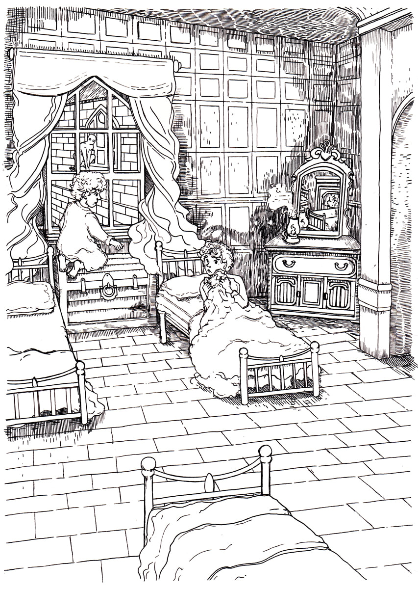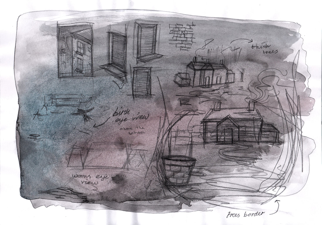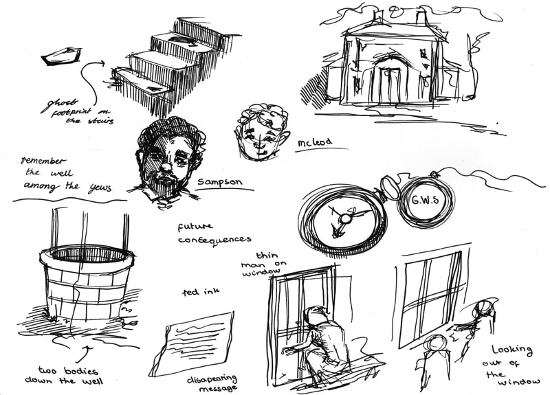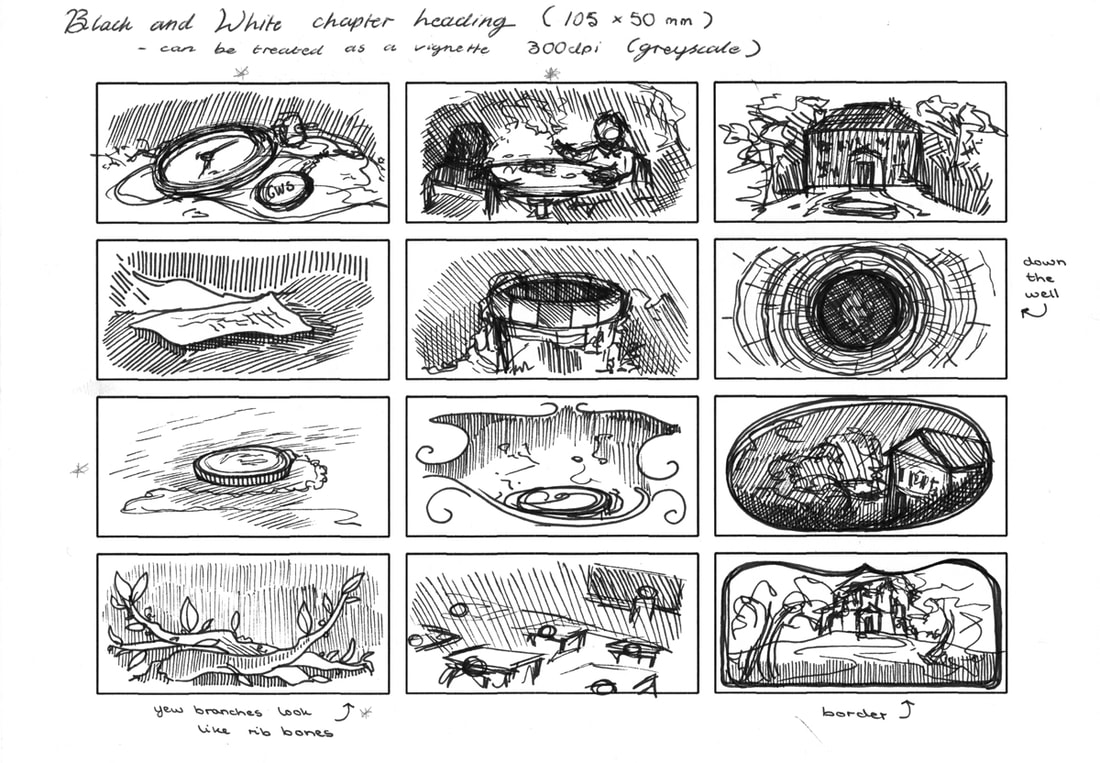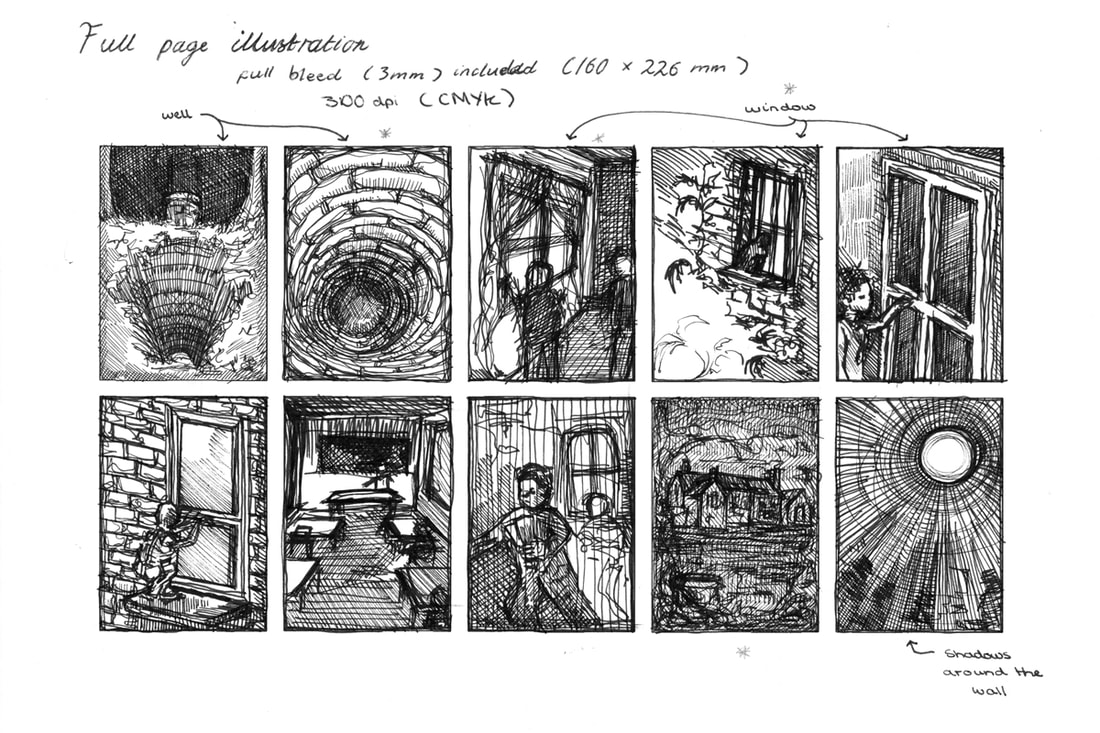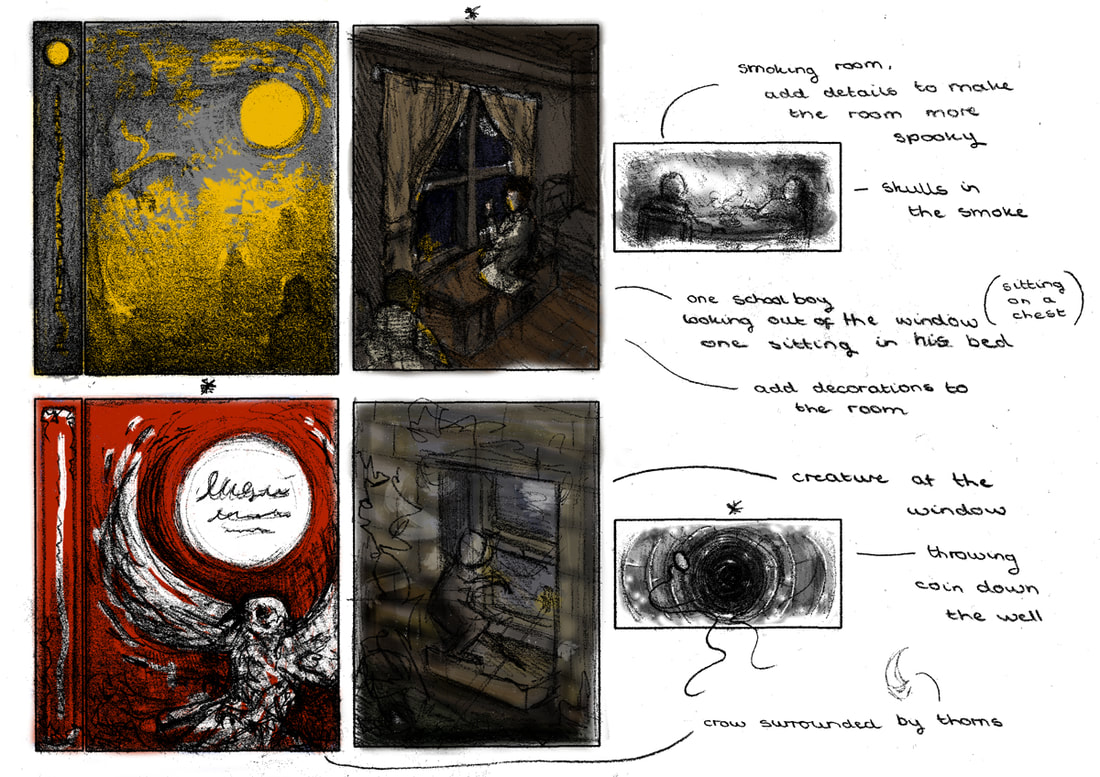 For the full page illustration my favourite design is the idea of the well, however I do think this gives away too much about the ending of the story to be the chosen illustration. Other than this idea my second favourite image was of the school boys looking out of the window, I just need to make sure that this image will give across the feeling of a ghost presence around the school.