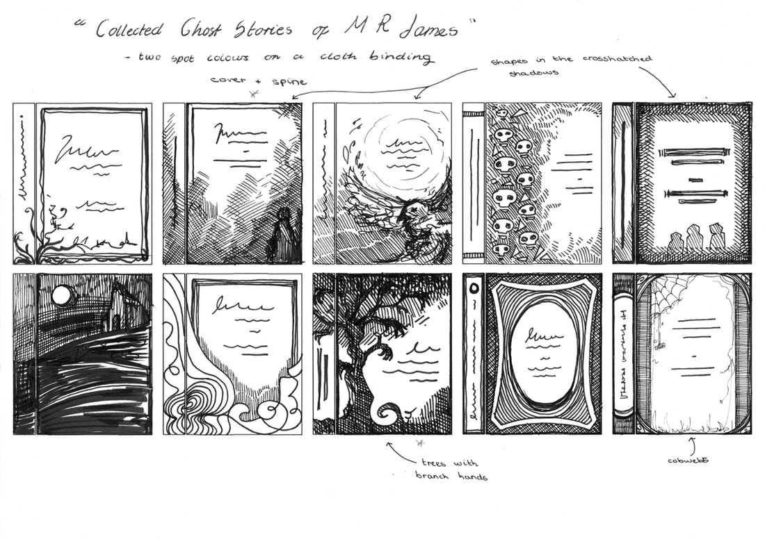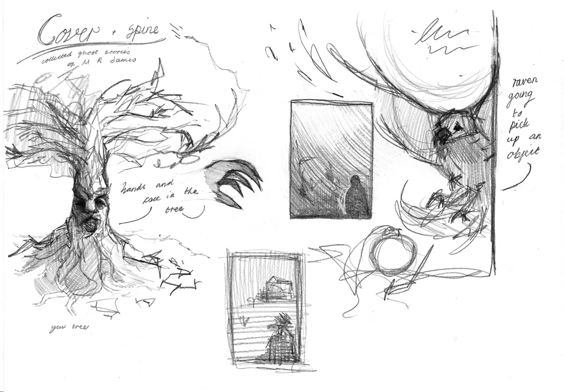 To create the design for my front cover and spine I created some thumbnails, I put stars beside my favourite thumbnails. I then developed these favourite thumbnails further to try and decide which idea to take into the final illustration. My person favourite design is the crow design however it isn't directly related to the ghost stories of M.R.James however crows are commonly used as a symbol of death and foreboding so it could work as a symbol. I also like the tree with hands, and a person in the fog which I think might work better as a cover of a ghost story book.