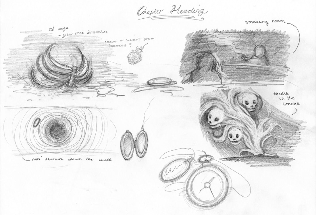 For the chapter heading I created multiple thumbnails for different ideas related to the overall story. After the thumbnail and developments for this idea I like the way the smoking room scene works best, I think the idea of faces in the smoke could portray the idea of two men sitting together telling ghost stories really well.