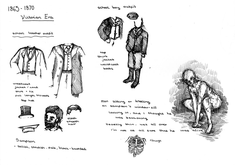 To start this project I listened to the audio version of the "School Story" by M.R.James and sketched as the story played to try and capture the main points of the story. After I did that I then moved onto creating some sketches that captured the style of Victorian England. I found this very helpful to give me and idea of how I would need to draw any people with my illustrations.