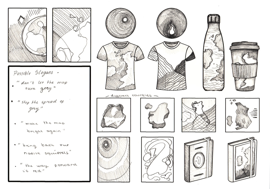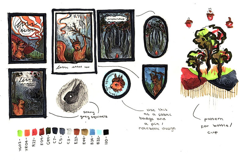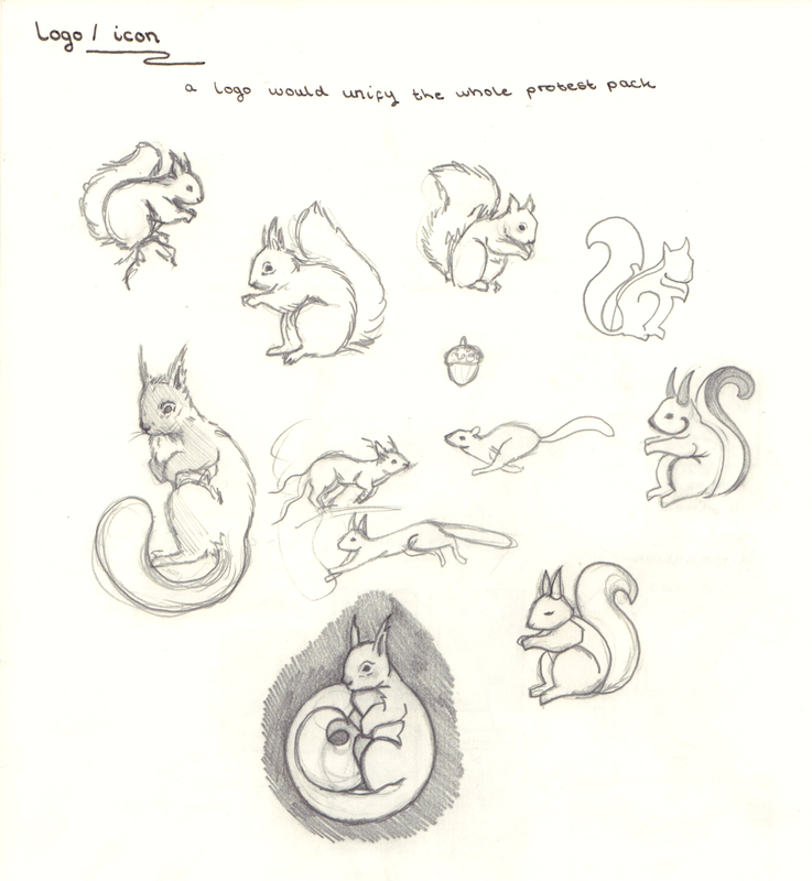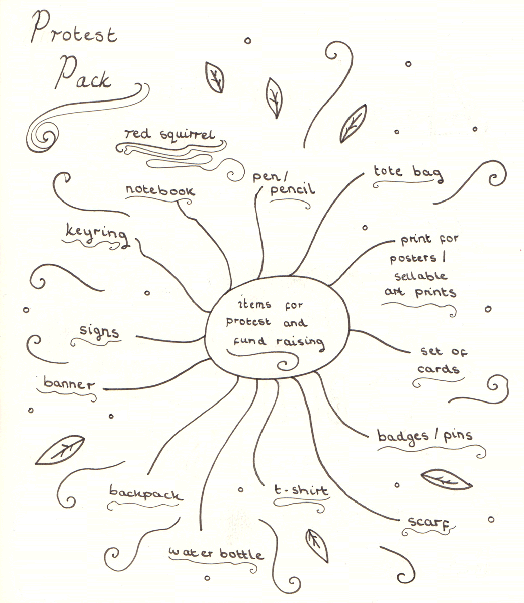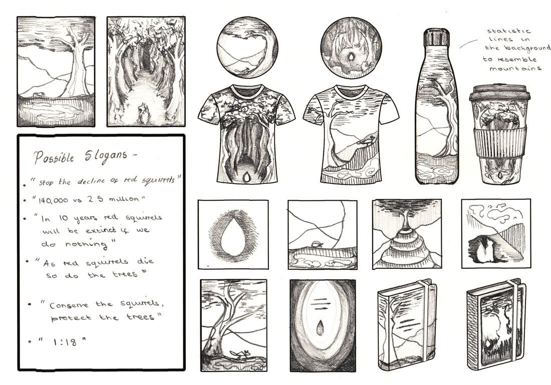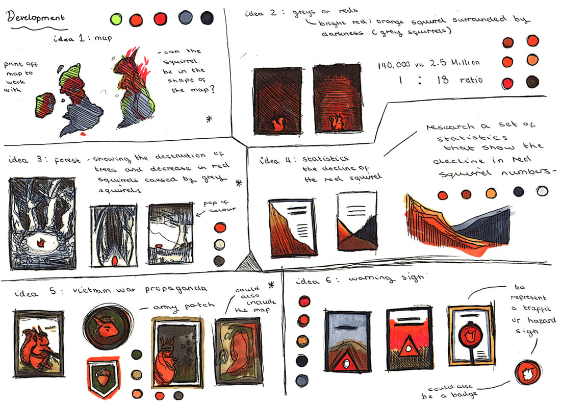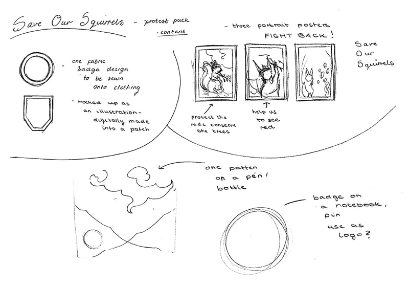 To start this project off I researched some facts and figures surrounding the decline in red squirrel numbers, these were collected to inform my protest pack and what I wanted to achieve through the creation of this. For me it was about raising awareness and hopefully encouraging people to donate to local read squirrel conservation charities. I additionally sketched out some quick concepts and ideas these really helped me to get an idea of the way I wanted to progress the project forward. My favourites are the middle two designs on the right hand page, the tree is very delicate and I also really like the orange tones illustration beneath it.