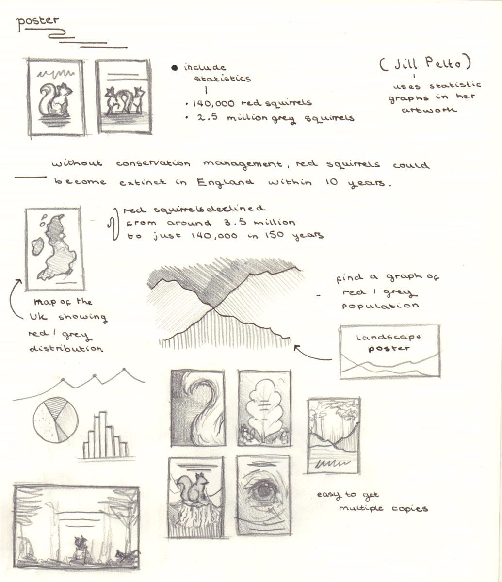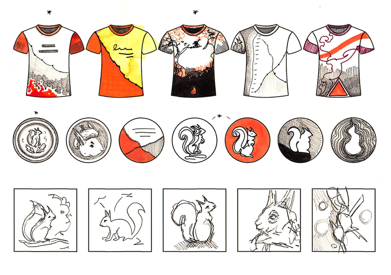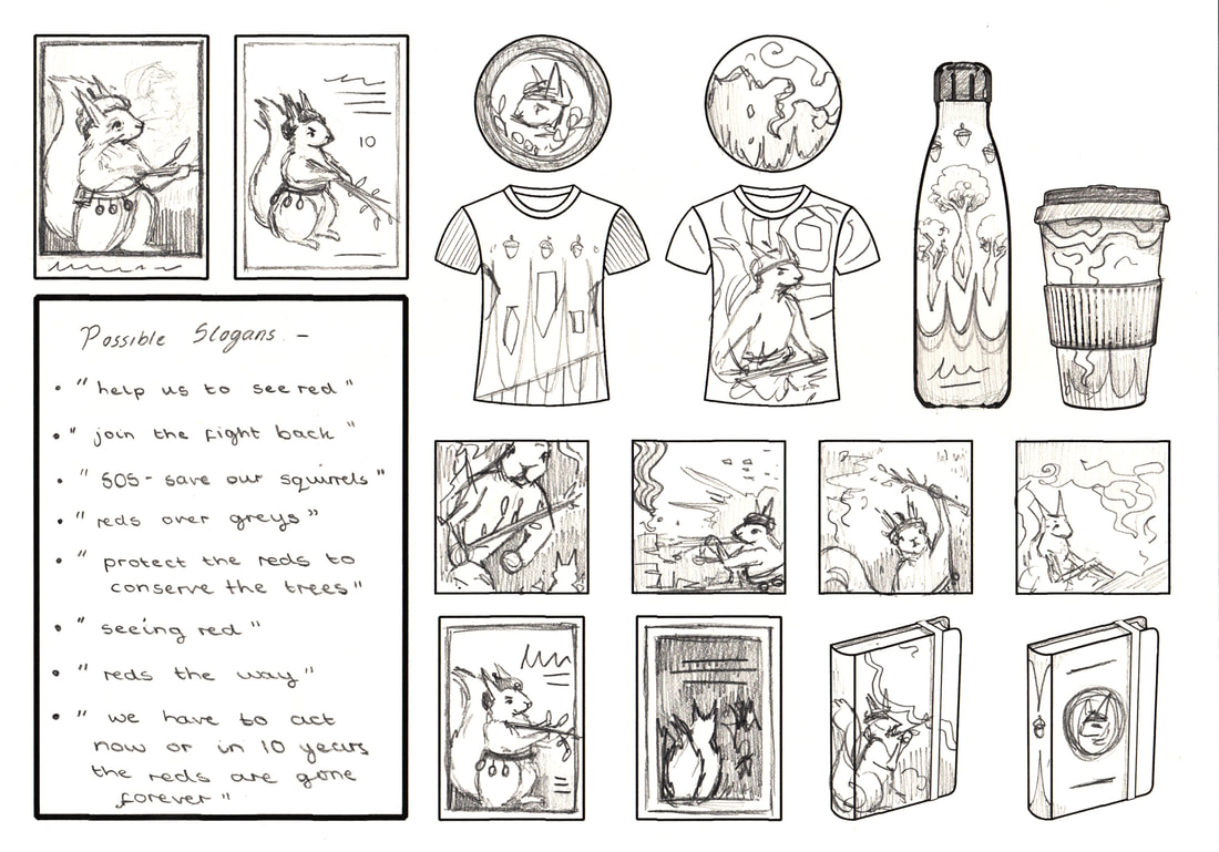 I knew from the start of this project that the most effective form of communication would be posters to give people information and get the chance to explain why Red Squirrels are so important. I have added little stars to the designs that I liked best. It was also at this time that Dani gave me the idea of Vietnam War Propaganda Squirrel, we all laughed about it at first but the idea of little squirrel fighting back is actually really powerful! I also intended to create some merchandise to go alongside my posters these could be used to raise funds for conservation.