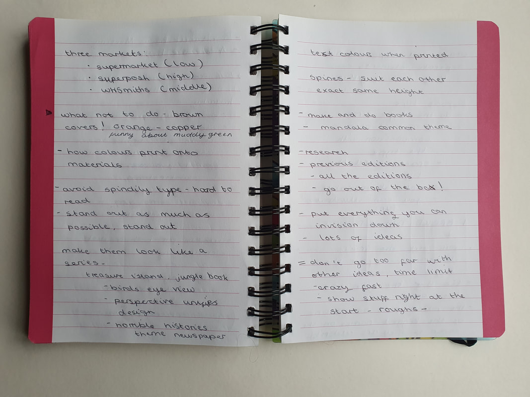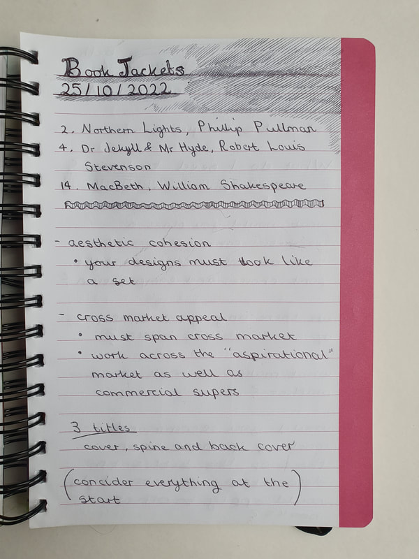 I started the project by thumbnailing some potential designs for the three book covers, after deciding on the cover I will them more onto adding a back cover and spine.