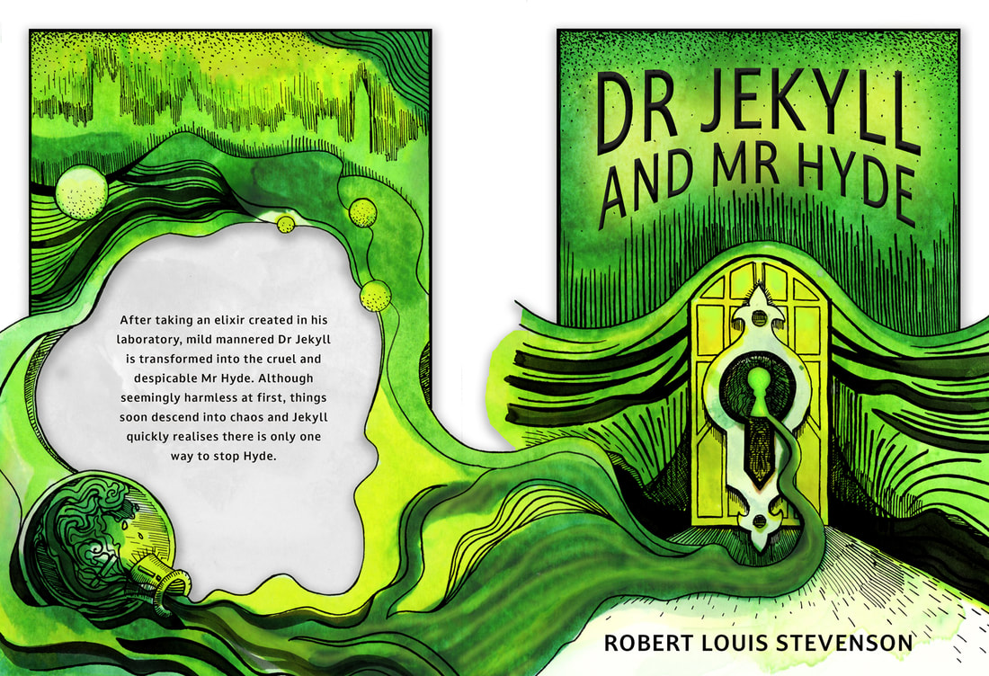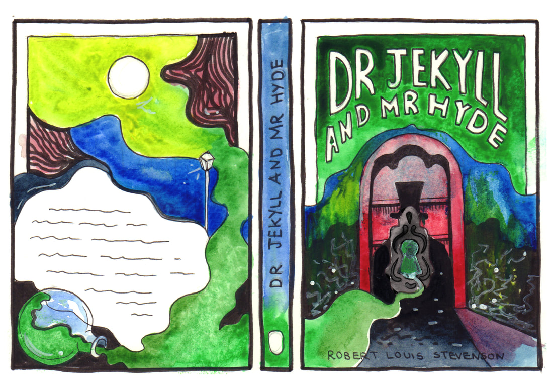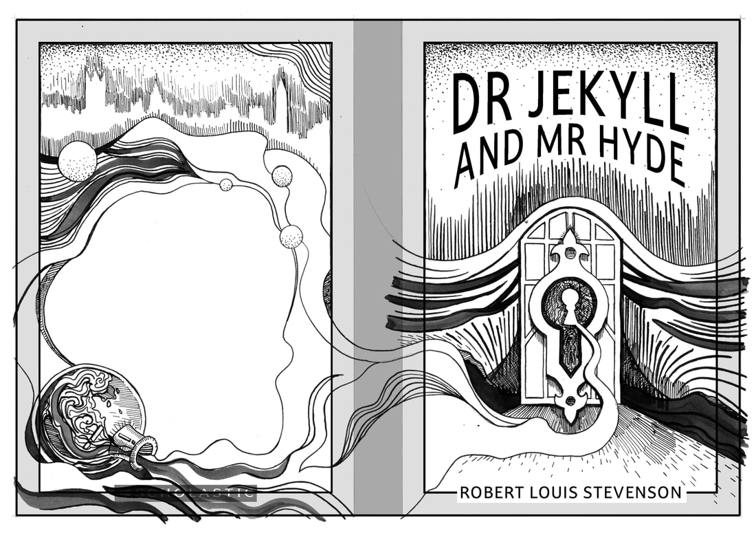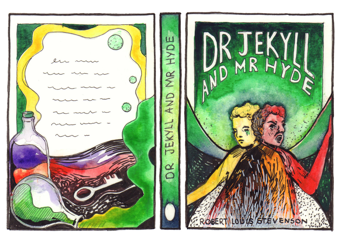 inking it in I didn't like how it looked at all. The closer portrait view of Dr Jekyll and Mr Hyde worked lot better, and finally I was happy with the book design.