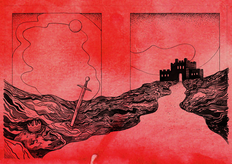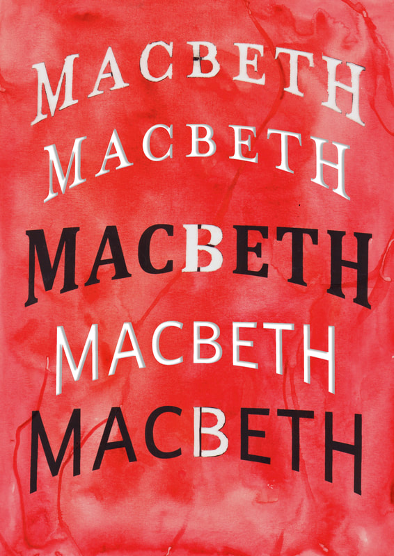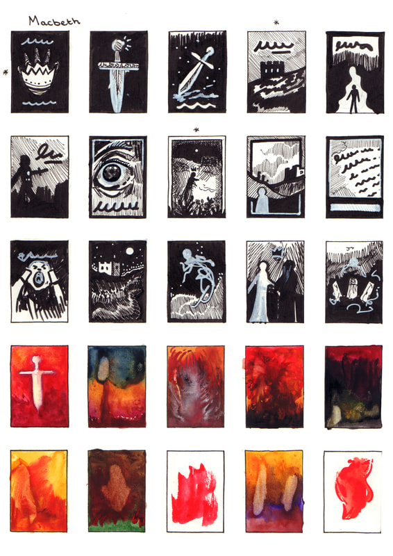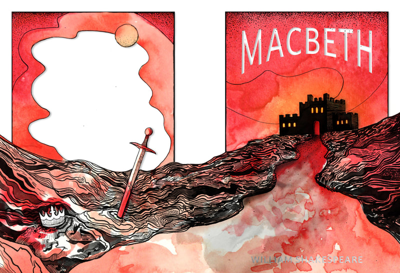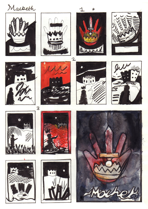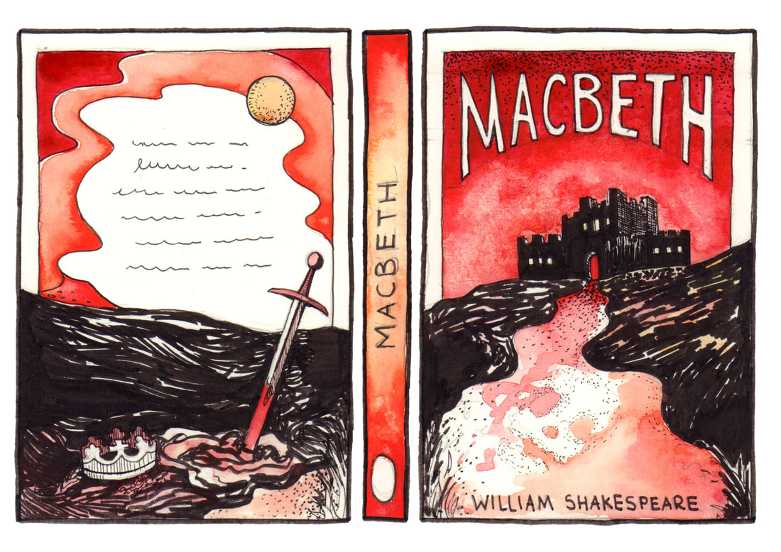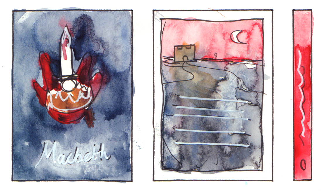 This is the process of me putting together the Macbeth cover and also playing around with overlaying watercolour scans onto the dip pen drawings.