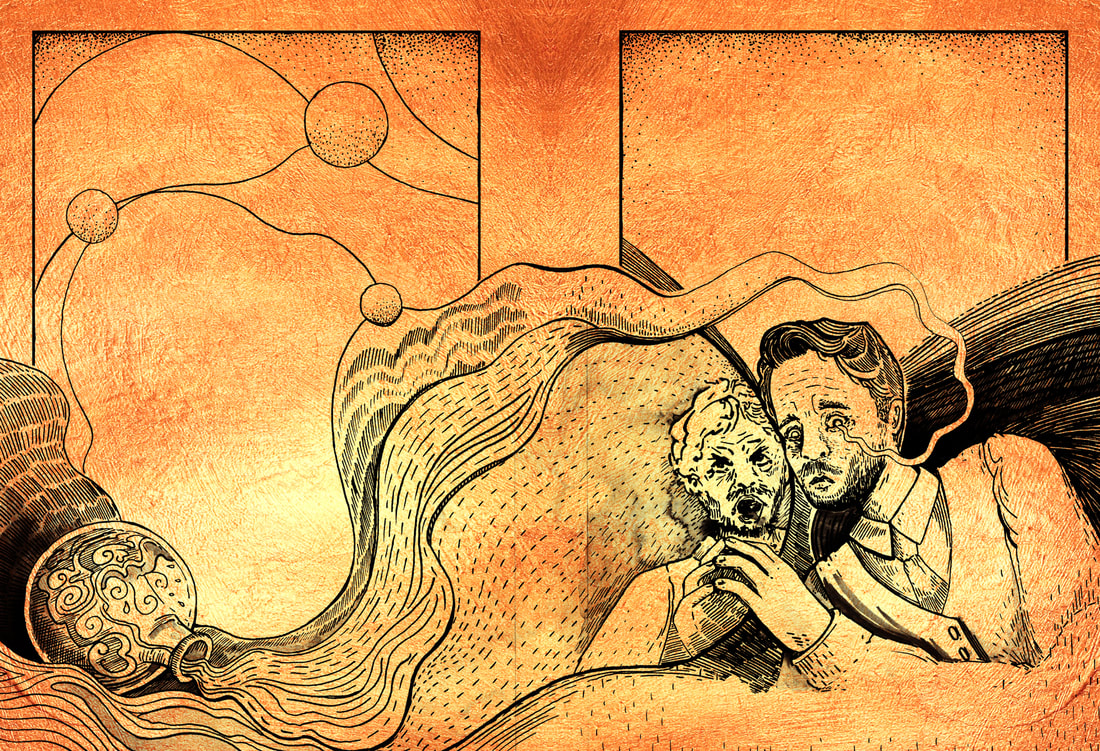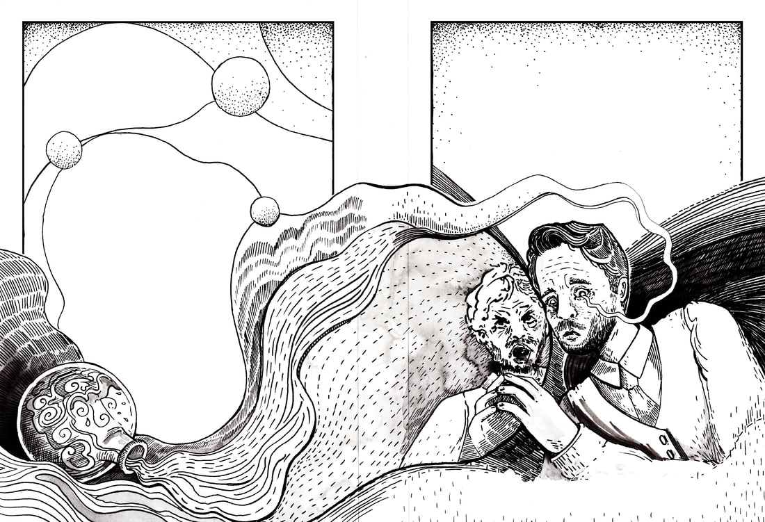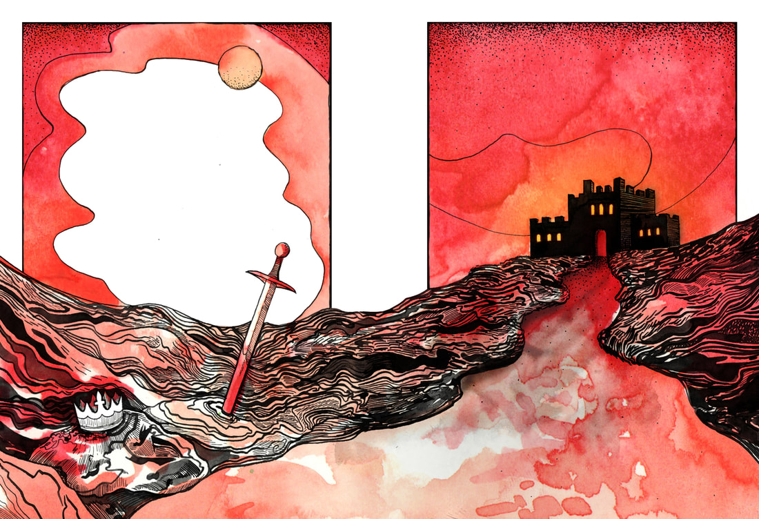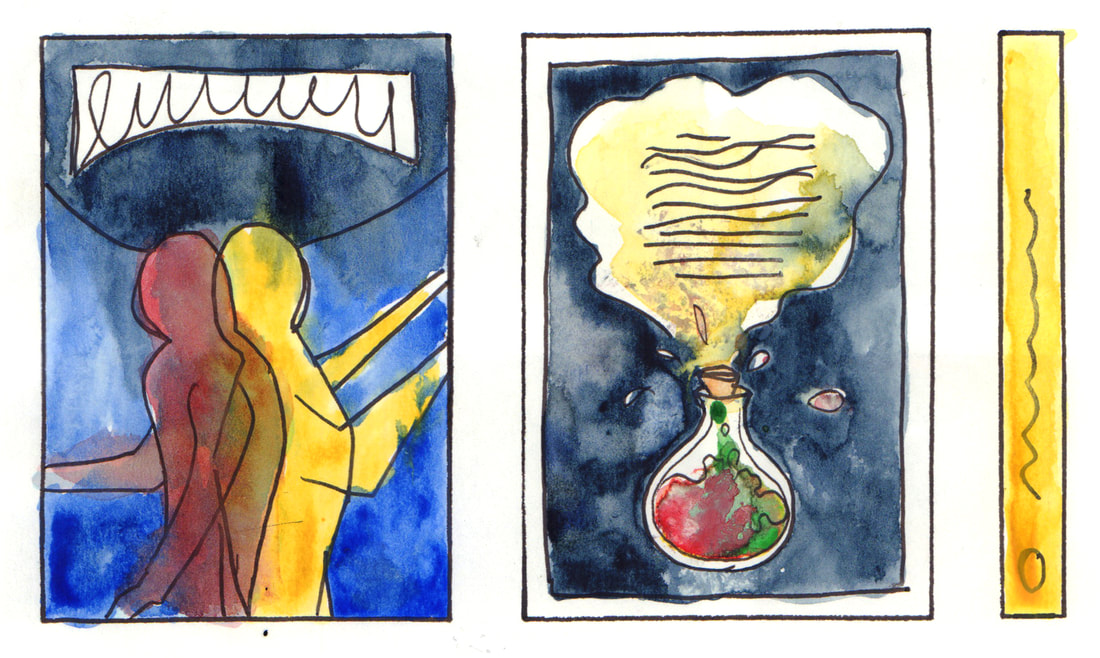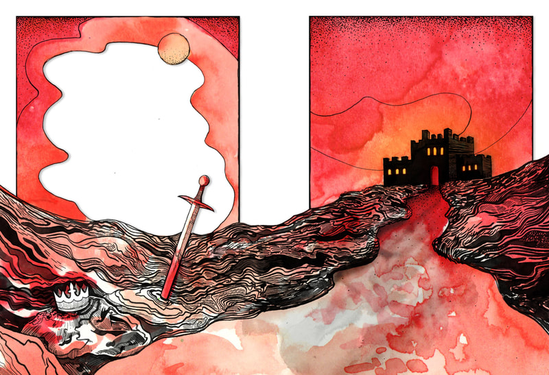 This is the process of me putting together the Macbeth cover and also playing around with overlaying watercolour scans onto the dip pen drawings.