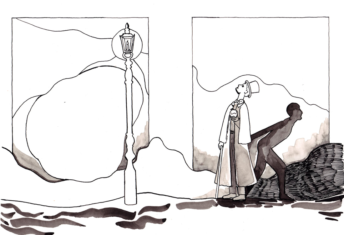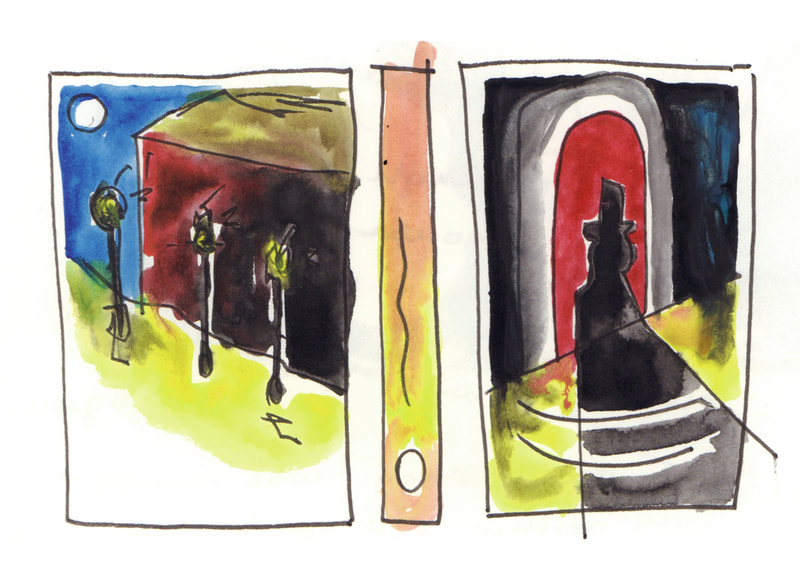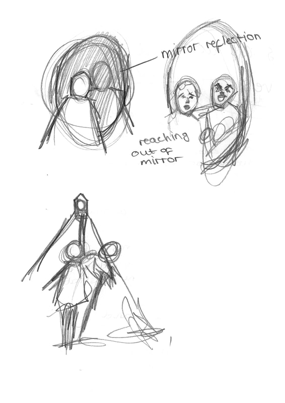 After sketching my ideas, I chose two to draw out as a larger designs. Initially I was going to pick the characters with the streetlight, however when I started