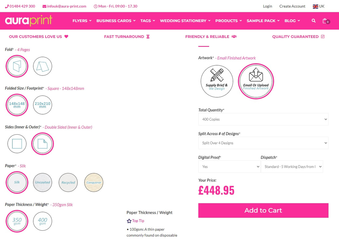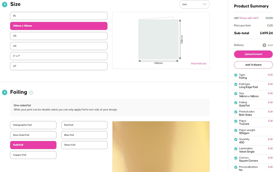 200 (148x148mm) square cards/ single sided, silk/ metallic gold foil/ full colour/ split over four designs = £223.95