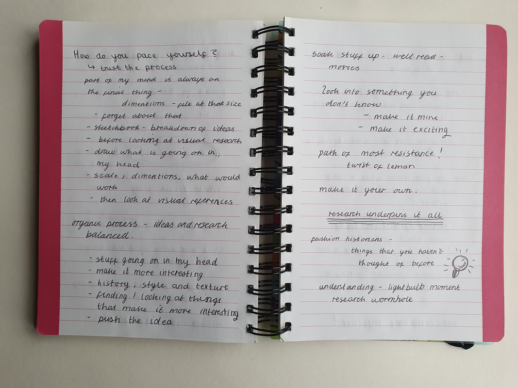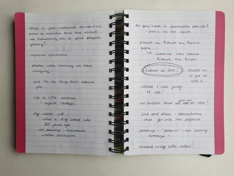 Possible Questions To Ask: How does your research influence your creative practice? How long do you spend researching before you start physically creating illustrations? How extensive is your research? What is your favourite unexpected piece of research that has influenced one of your projects greatly? How do you incorporate what you have learned through research into your illustrations? Is it the colours, style or details of time and place that make it into your work?
