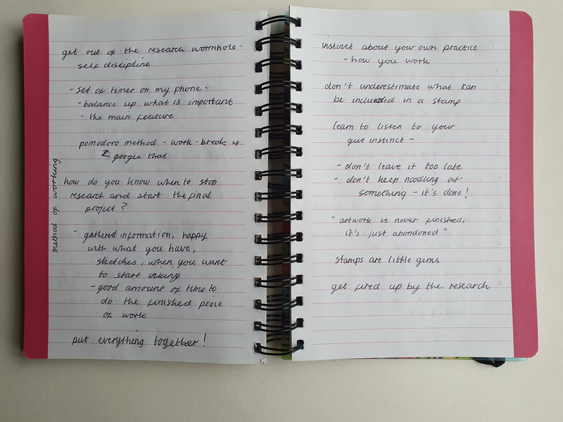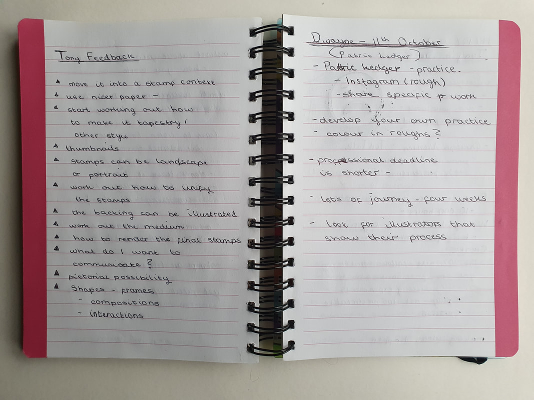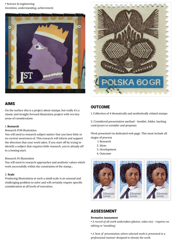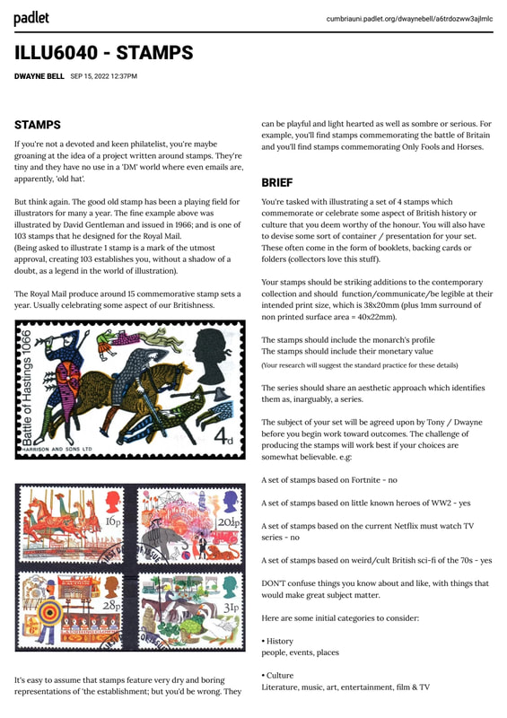 Planning How To Proceed With This Project These are some quick things I noted down when Dwayne came over to our desk area to talk to us, these points have been very helpful as I am moving further into this project. My plan going forward is to start to work out what kind of style will work at stamp size. |