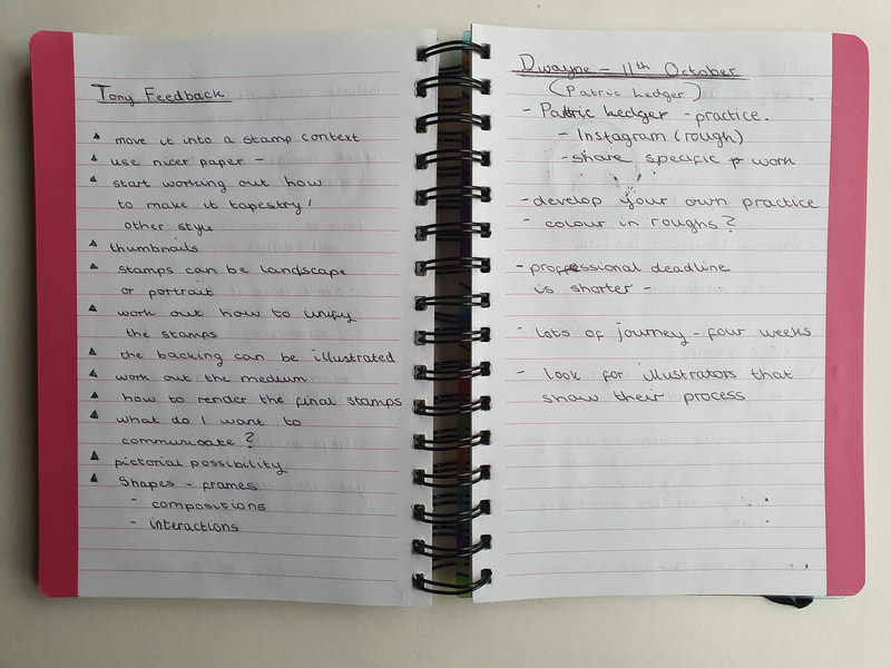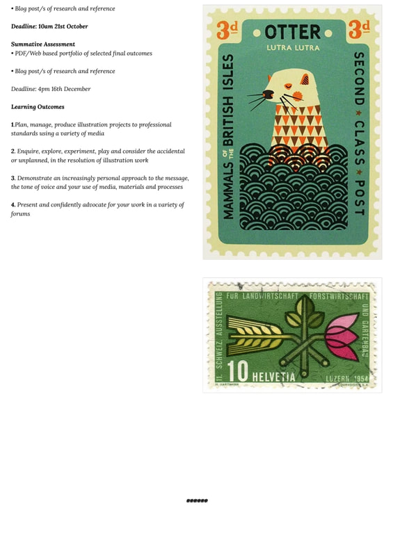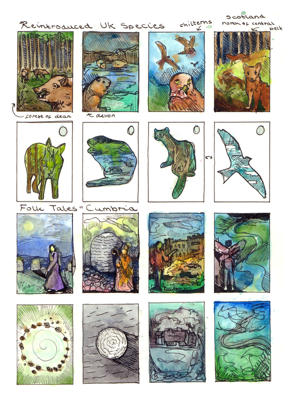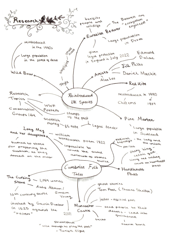 I decided on my two favourite concepts "Reintroduced UK Species" and "Folk Tales of Cumbria" and used this as a starting point for some research mind maps. After feedback with Tony and through my own research I have decided that I thin that the folk tales of Cumbria would be a subject that would require more research and an idea that I don't have a clear vision for yet which is what makes this a good topic to take forward into this process. I would have preferred to do the reintroduced species stamps but I don't think they would have been as challenging for me to create.