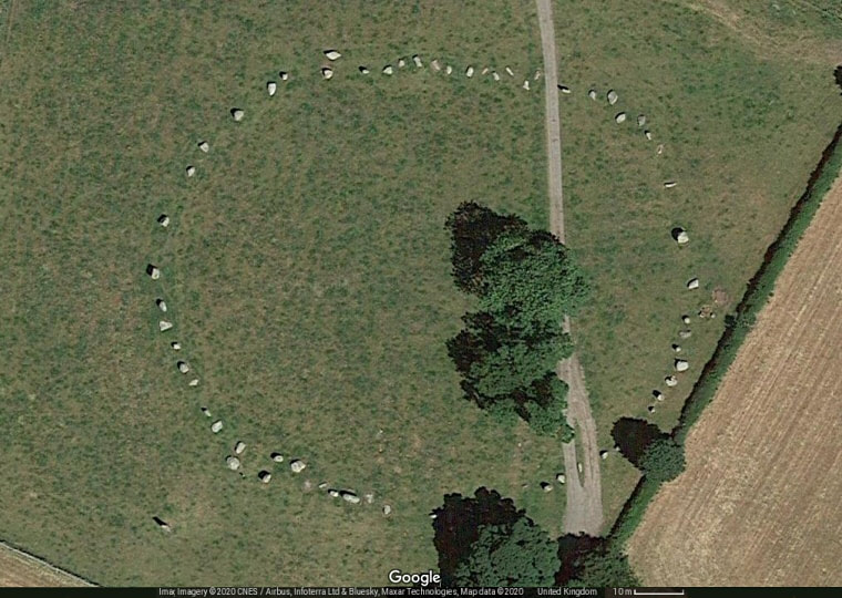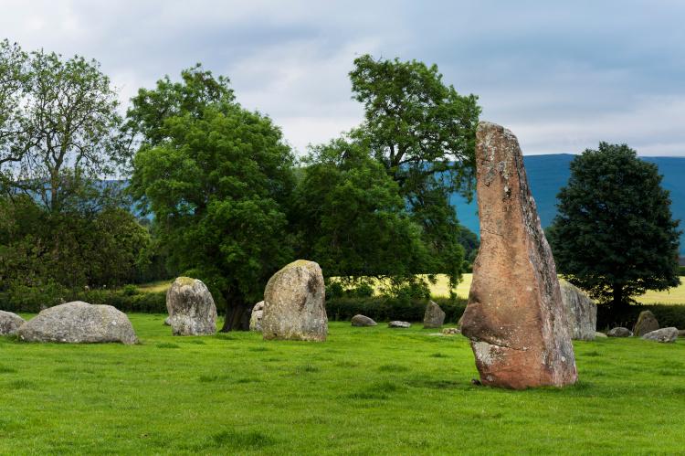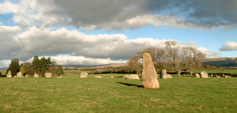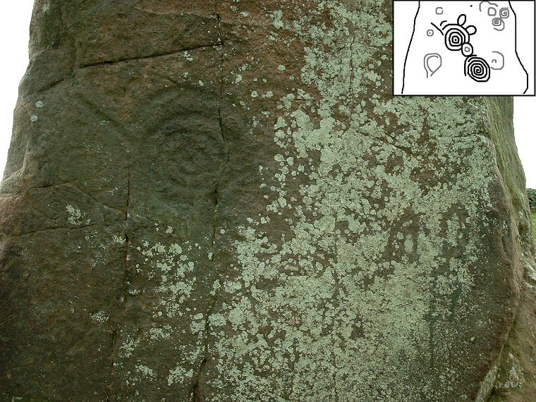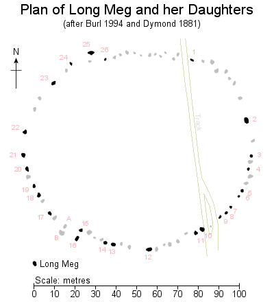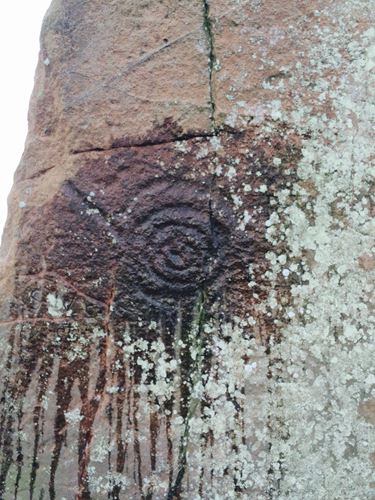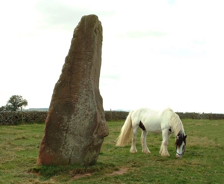 "Local legend claims that Long Meg was a witch who with her daughters, was turned to stone for profaning the Sabbath, as they danced wildly on the moor. The circle is supposedly endowed with magic, so that it is impossible to count the same number of stones twice, but if you do then the magic is broken." "The largest of the stones in the circle is 3.3m high and estimated to weigh 28 tons. There are 27 stones still standing in the circle, with a whole load of others reclining. ‘Long Meg’ herself is an outlier, made from local sandstone, and is 3.7m high. The pink stone has a strange quality in certain lights – it ‘glitters’ – and it’s then that you catch sight of the faint, eerily ancient, spiral carvings. Some very practical archaeologists reckon that the menhir’s purpose was to point the way to the circle itself, as the lay of the land means that a traveller from the Eden Valley would have seen it on the horizon long before the circle came in to view. I can find no record of archaeological excavations or ‘finds’ here, but my most worthy tome estimates the date to be third millennium BCE. That’s five thousand years old. What was it for? Well, we just don’t know, but, like a lot of circles, it is aligned astronomically. At winter solstice, if you stand in the centre of the circle, the sun sets behind Long Meg." |