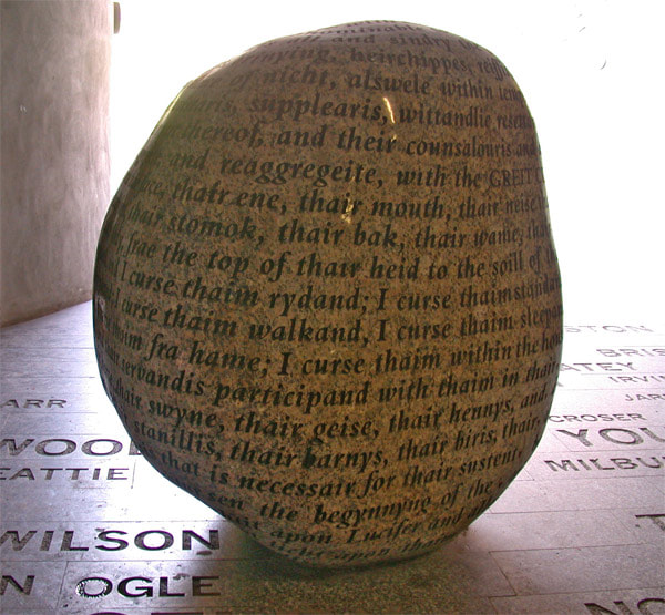 "In 2001 a large stone inscribed with a curse was place in the underpass near Carlisle’s Tullie House Museum. It was designed by a local Carlisle artist named Gordon Young and made by Andy Altman. The wording came from The Monition of Cursing by Archbishop Gavin Dunbar of Glasgow in the 16th century. The curse was read out on every pulpit throughout the debatable lands (Scottish border) in a bid to excommunicate the thieving, murdering, raping and godless Reiver families of the region. However, for some strange reason, a few Carlisle residents blamed the stone and its apparent occult powers for some of the city’s unlucky events. I am not sure why though, as these are the words of a holy man, a Bishop of Glasgow. The BBC covered the story of the cursed stone on in the following article entitled ‘Curse of the Cursing Stone’ on 2 March 2005."