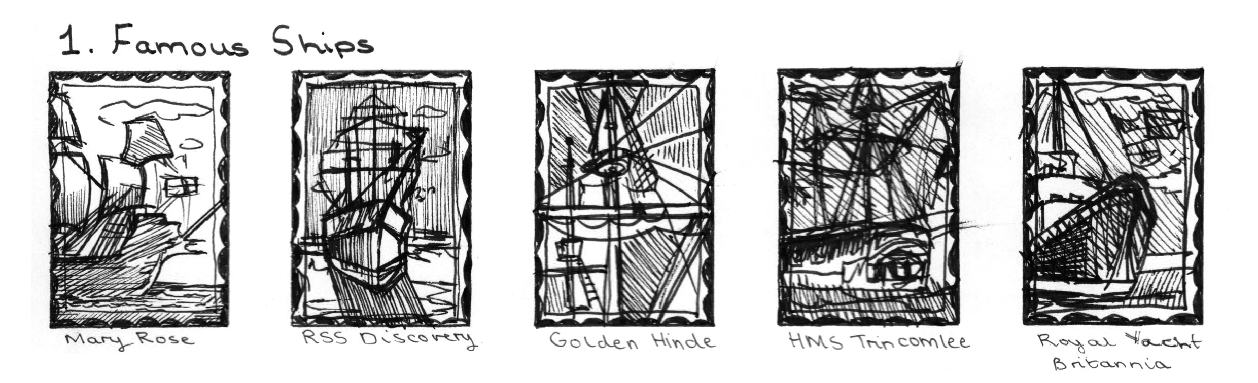 Although it was an enjoyable style to work in, it didn't fit very well with the stamp style as wen this style was scaled down it wouldn't be as readable.