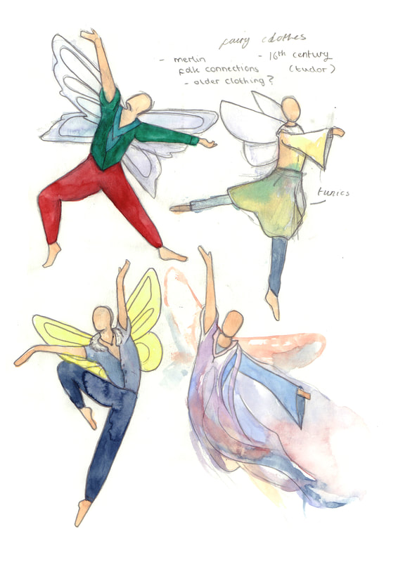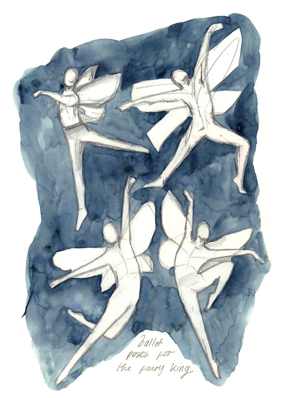 After the session with Jill Calder I decided to create a few sketch pages foe each of my chosen folk stories. I decided that ballet poses would be the best idea for a Fairy King as I believe that the beautiful movement of ballet dancers could easily be translated into a fairy shape. I also think I would like to go with a blue cool colour scheme for this story.