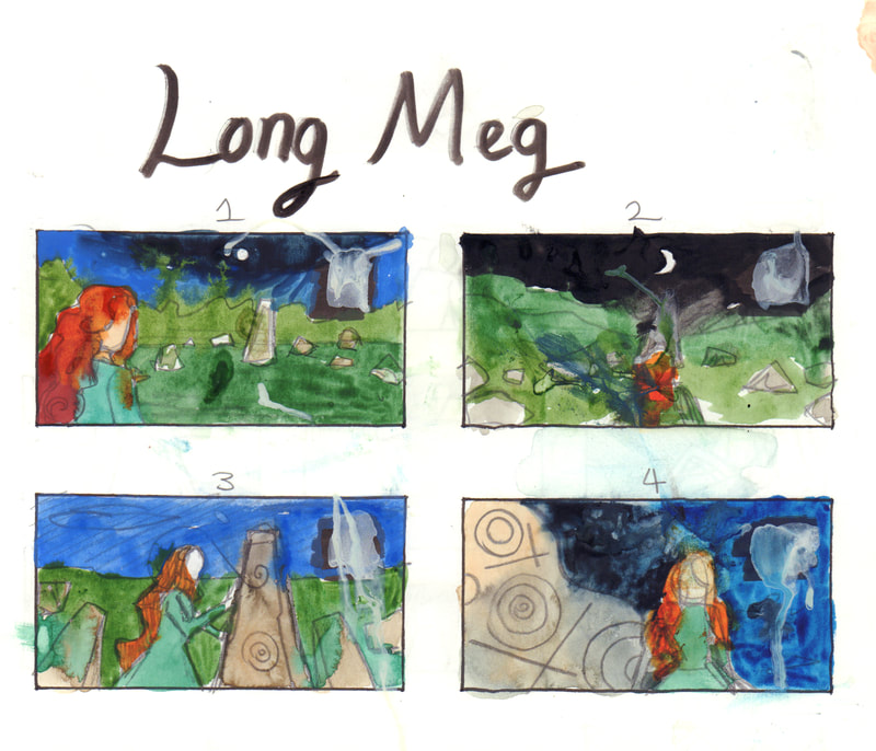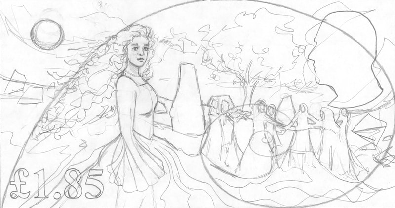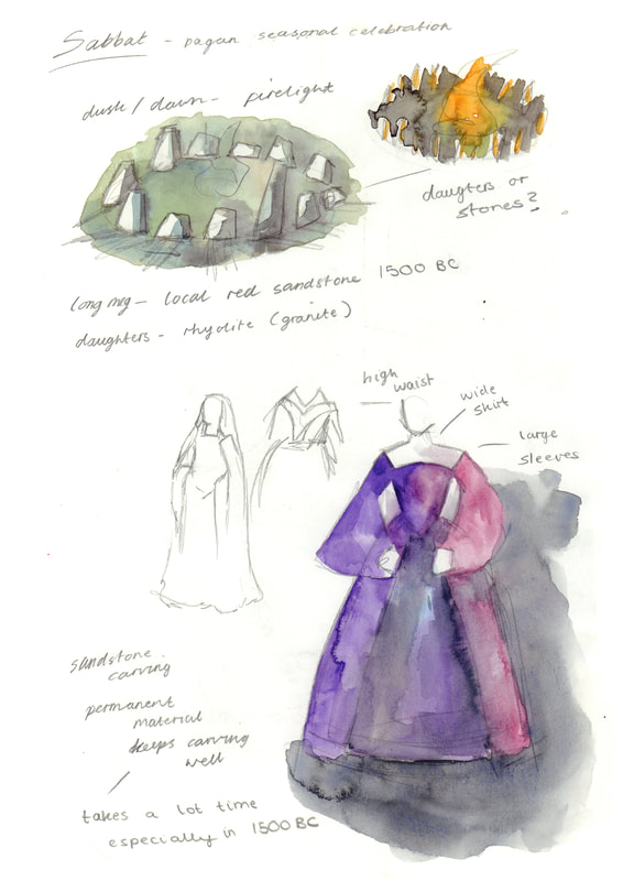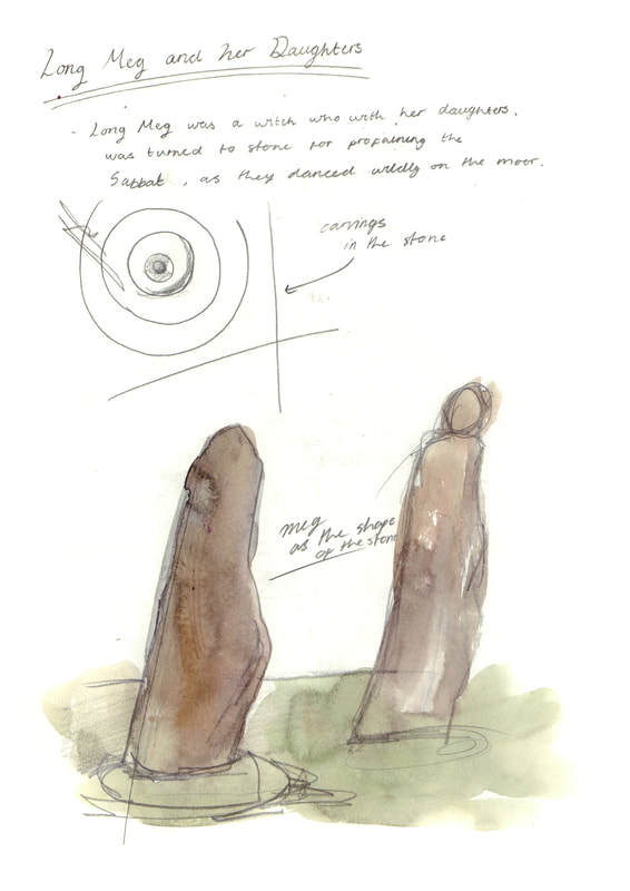 I moved onto sketching ideas for Long Meg next, I looked into the shapes carved into the long meg stone as well as the dress style of women at the time this stone circle is believed to originate. I don't know yet if I am going to have the place or the people in my final stamps so I am just gathering information so that I can make my decision about what to include.